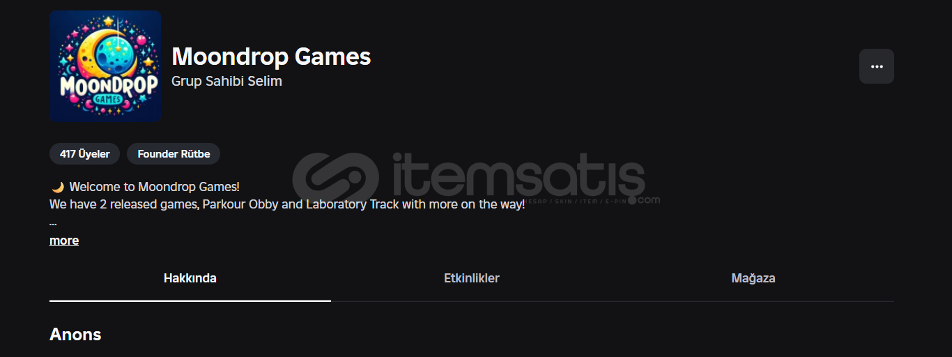 417 Üyeli Grup.9 Oyunu Var.1 adet tişört var bunu satarak robux kazanabilirsiniz.Grup ismi orjinal ve tektir.Grupta 7 rol vardır.Aklınıza takılanlar olursa sorabilirsiniz.