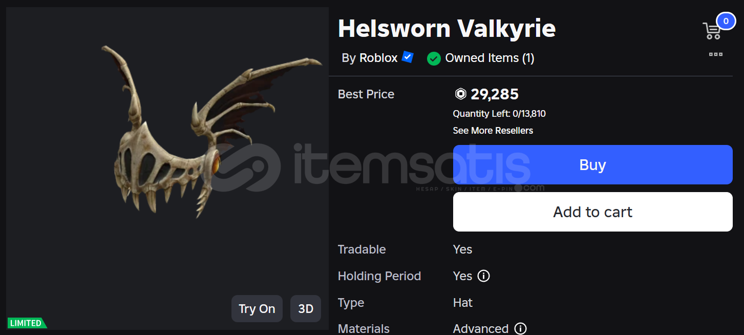 Helsworn Valkyrie trade ile verilir.Limited kendi hesabimdadir, bu bir tedarik ilani degildir item suanda envanterimdedir.Aldiktan sonra hesabindan geri cekilmesini istemiyorsan dogru yerdesin.Robux ile catalogdan alinmistir, alicak kisiye talep ederse kanit gosterebilirim.