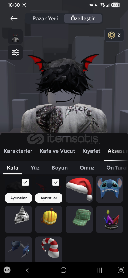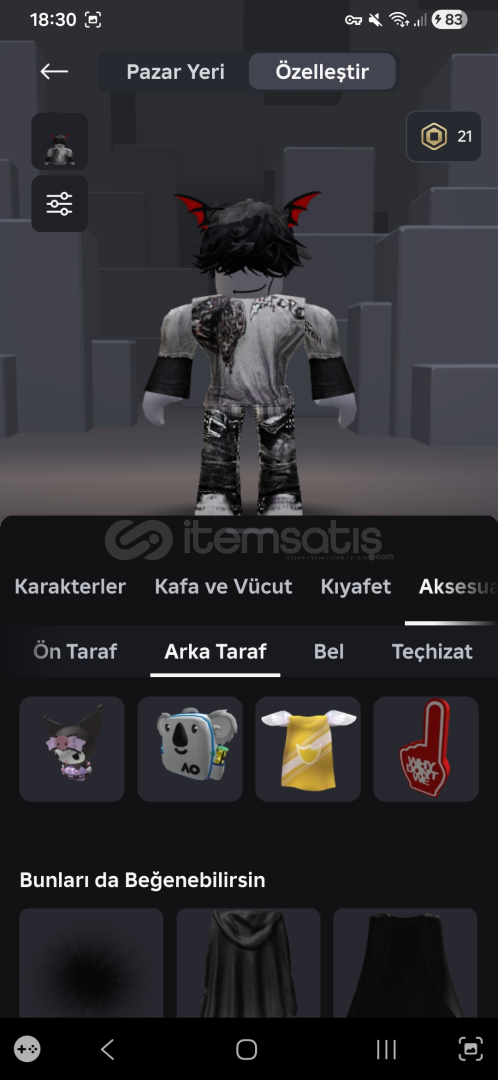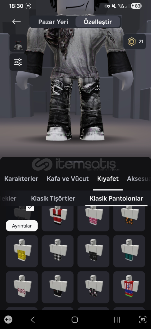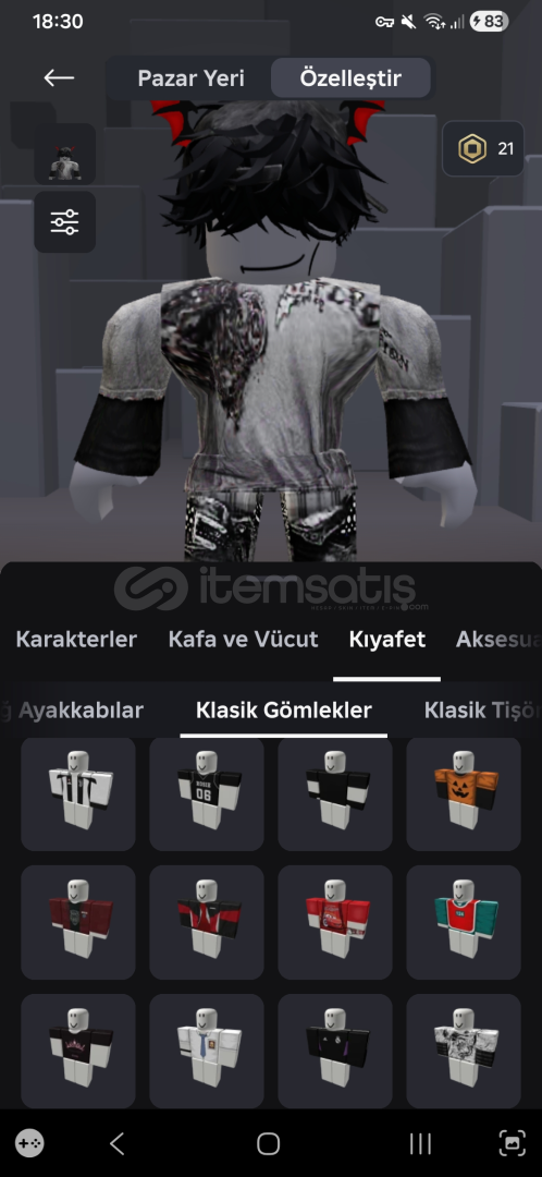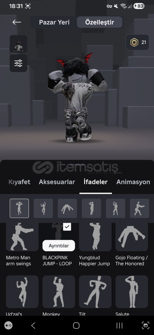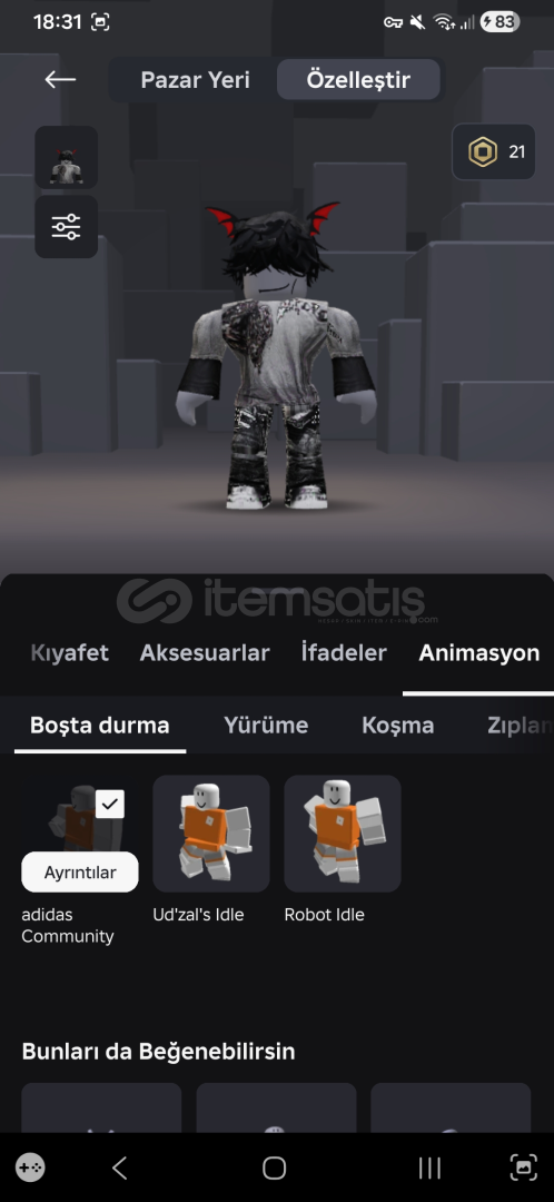 hesap doludur kıyafetleri pantalonlar aksesuarlar emojiler ve animasyonlar vardır şuanda 21 robux vardır