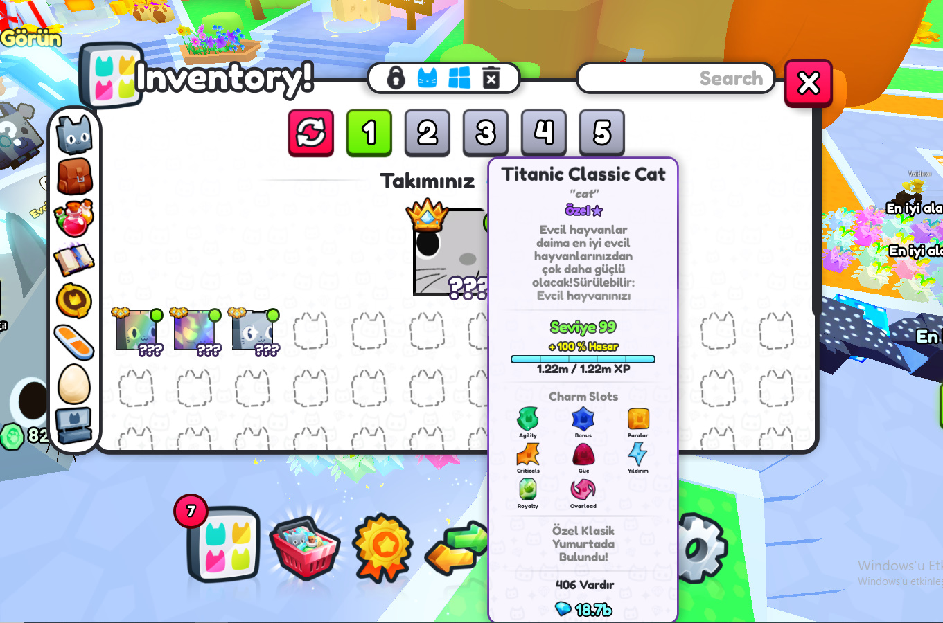 1X TİTANİC CLASSİC CAT,1X RB HUGE STORM AGONY,1X RB HUGE EASTER CAT,1X HUGE CAT,72X BRAİNROT YUMURTASI,HELİKOPTER KAYKAY VE UFO VAR TOPLASANIZ EN AZ 41B GEMS DEĞERİ VAR BU İNVENTORYNİN ALMAK İSTEYEN OLURSA KISA SÜREDE TESLİMAT OYUNDA GERÇEKLEŞTİRİLECEK EFENİM İYİ GÜNLER.