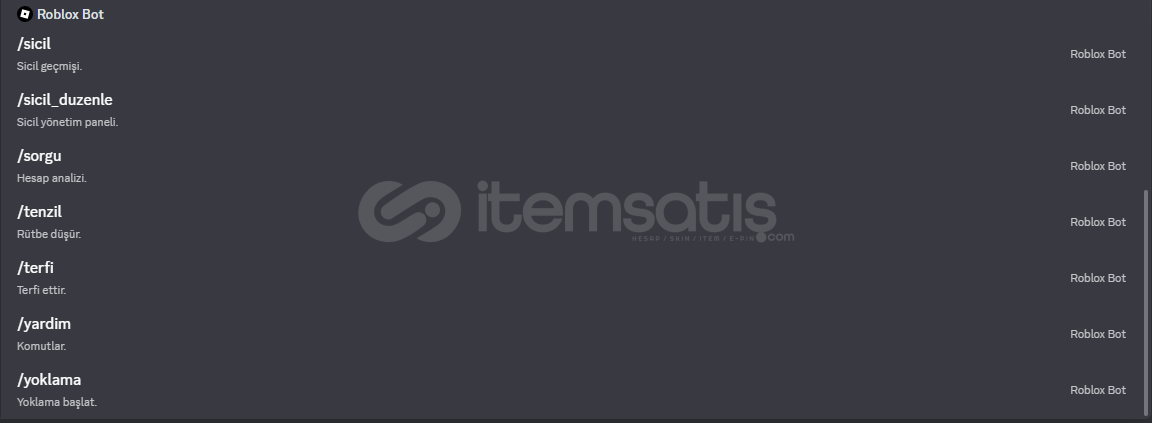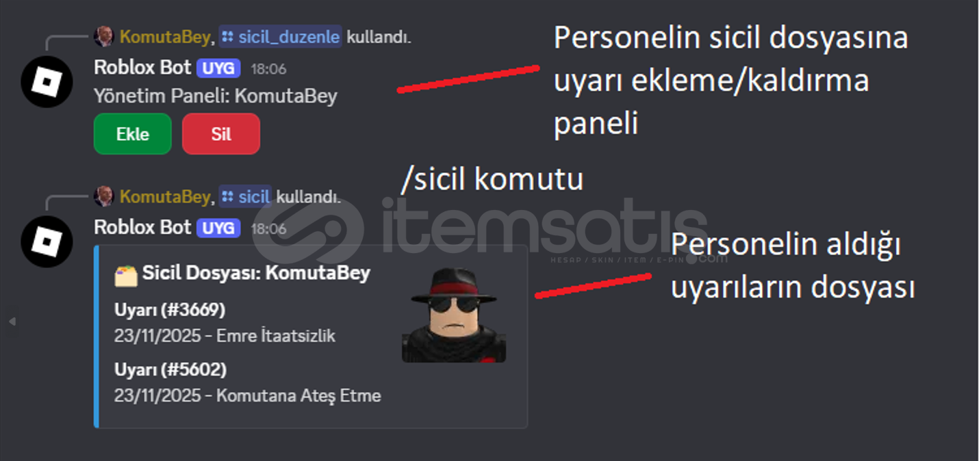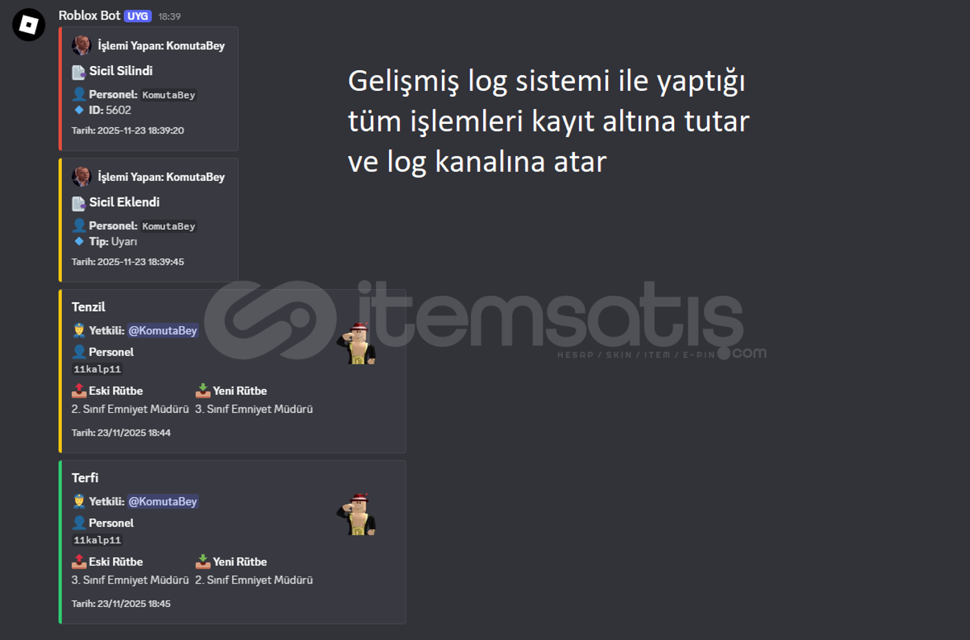 🚀 ROBLOX ASKERİ YÖNETİM SİSTEMİ v4.0Grubunuzu sıradanlıktan kurtarın! Görsel odaklı, güvenli ve profesyonel yönetim botu ile tanışın.⚡ ÖZELLİK VİTRİNİ👮 RÜTBE & YÖNETİM ⬆️ /terfi: Personeli terfi ettirir. (Özel Resimli Kart Üretir)⬇️ /tenzil: Personelin rütbesini düşürür. (Özel Resimli Kart &Uum...