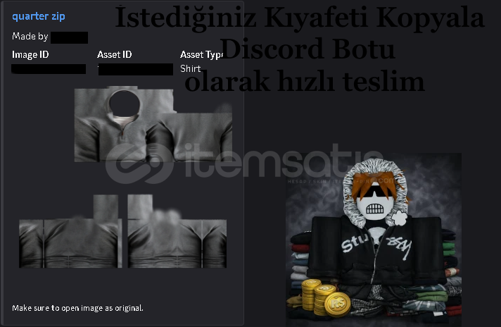 Roblox Shirt ve Pants Kopyalama Discord Botu2 adet bot vardır ben ben kesin olması için ikisinide sizin grubunuza ekleyeceğimNasıl kopyalayacağınızı gösterebilirim Bekleme süresi yok istediğiniz zaman kullanabilirsinizKıyafetlerde DMCA riski çok az da olsa vardır bi sorun olursa sorun sizindir ama büyük ihtimalle uyarı yersiniz en kötüİStediğiniz zaman alabilirsiniz hızlıca...