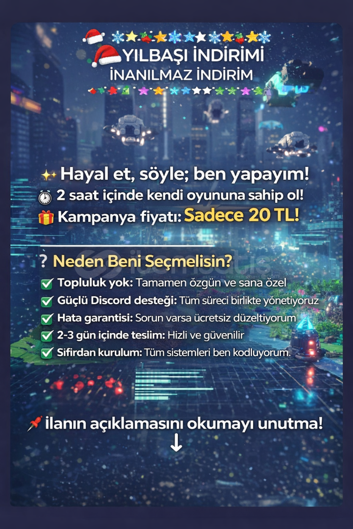 🎮🚀 ROBLOX STUDIO İLE OYUN GELİŞTİRME FIRSATI! 🚀🎮🎄YılBaşına Özel 20TL✔🔥💸 2 SAAT – SADECE 20 TL KAMPANYA! 💸🔥❌ Sadece oyun oynayıp vakit kaybetme!i✅ Kendi fikirlerini hayata geçir, ben senin için oyunu yapacağım!💡 Detaylar:🎨 Oyun tamamen senin tercihlerine göre şekillenecek❌ Oyun ToolBlox olmayacak\...