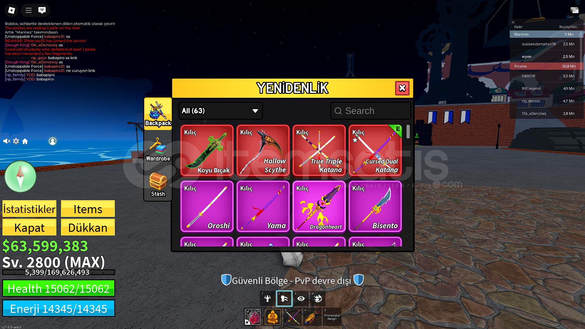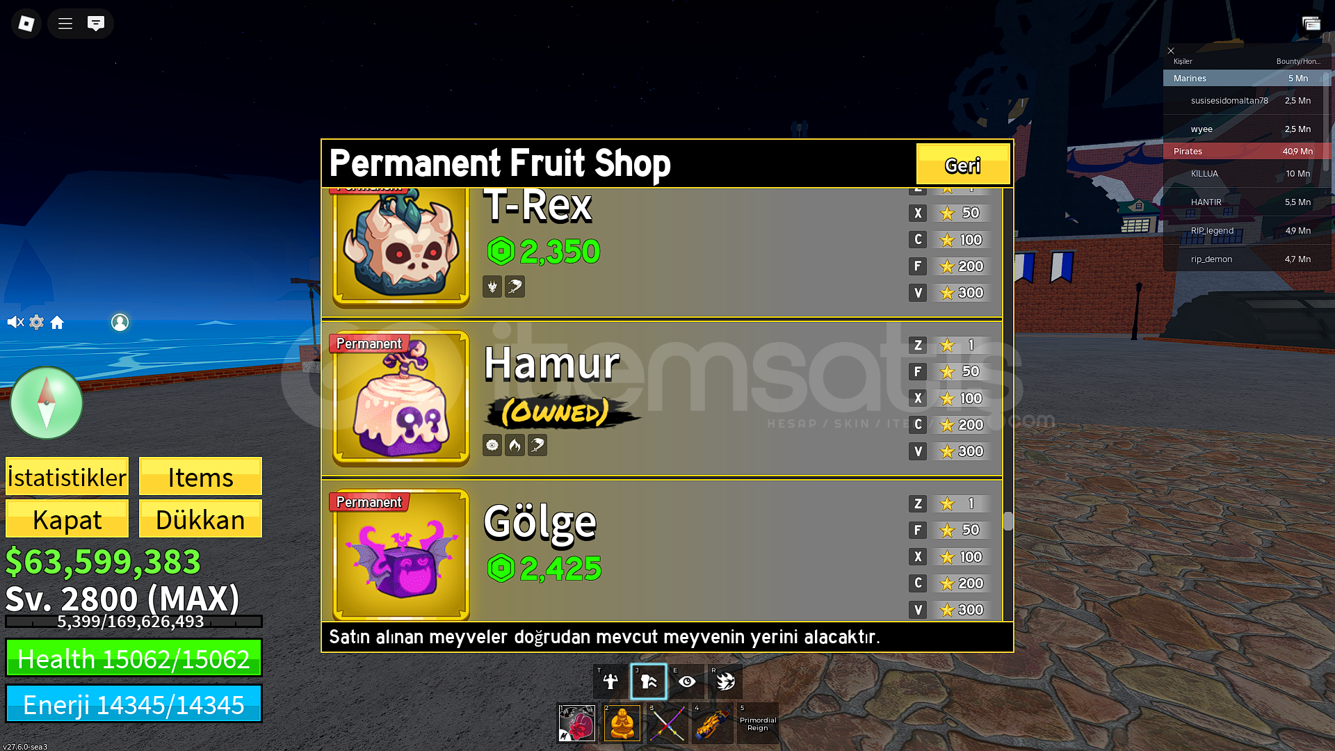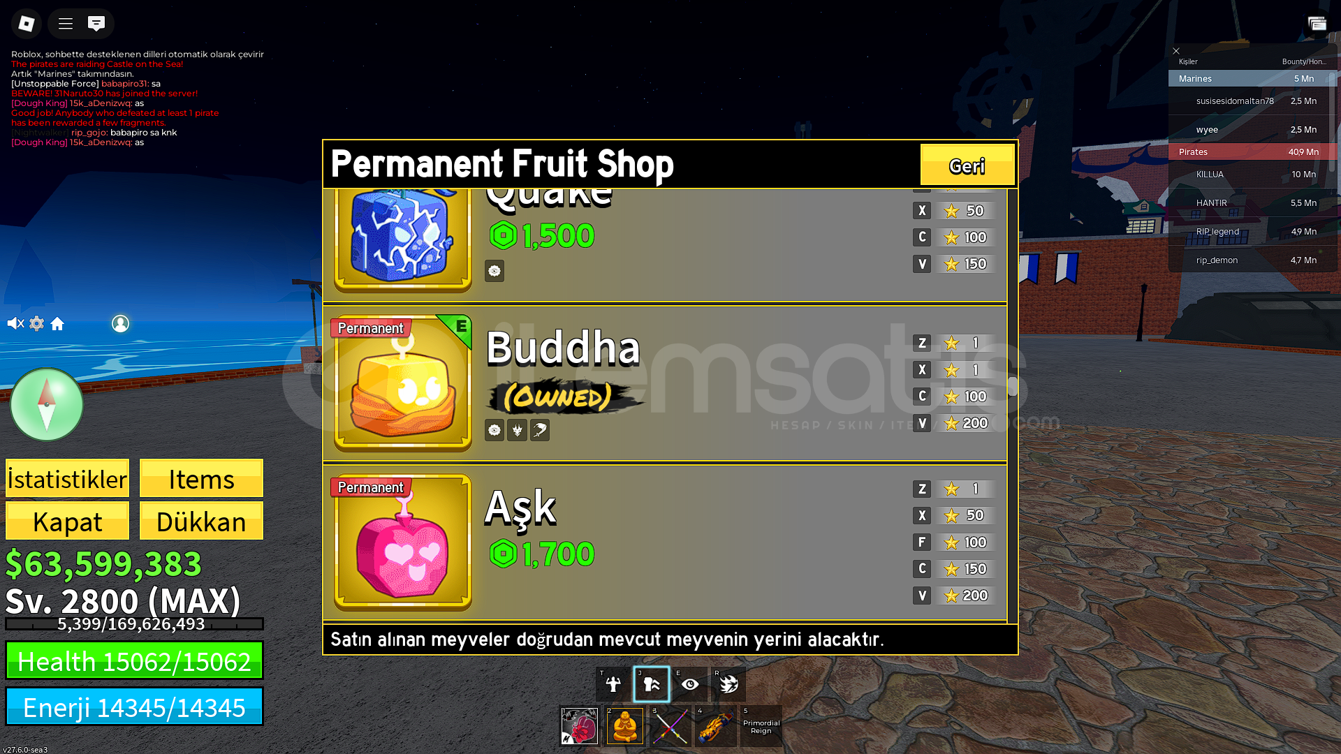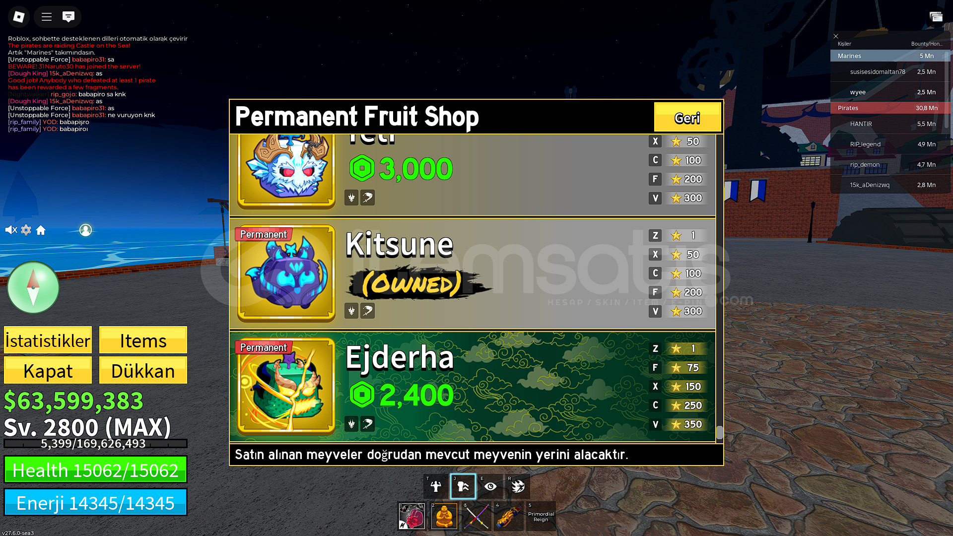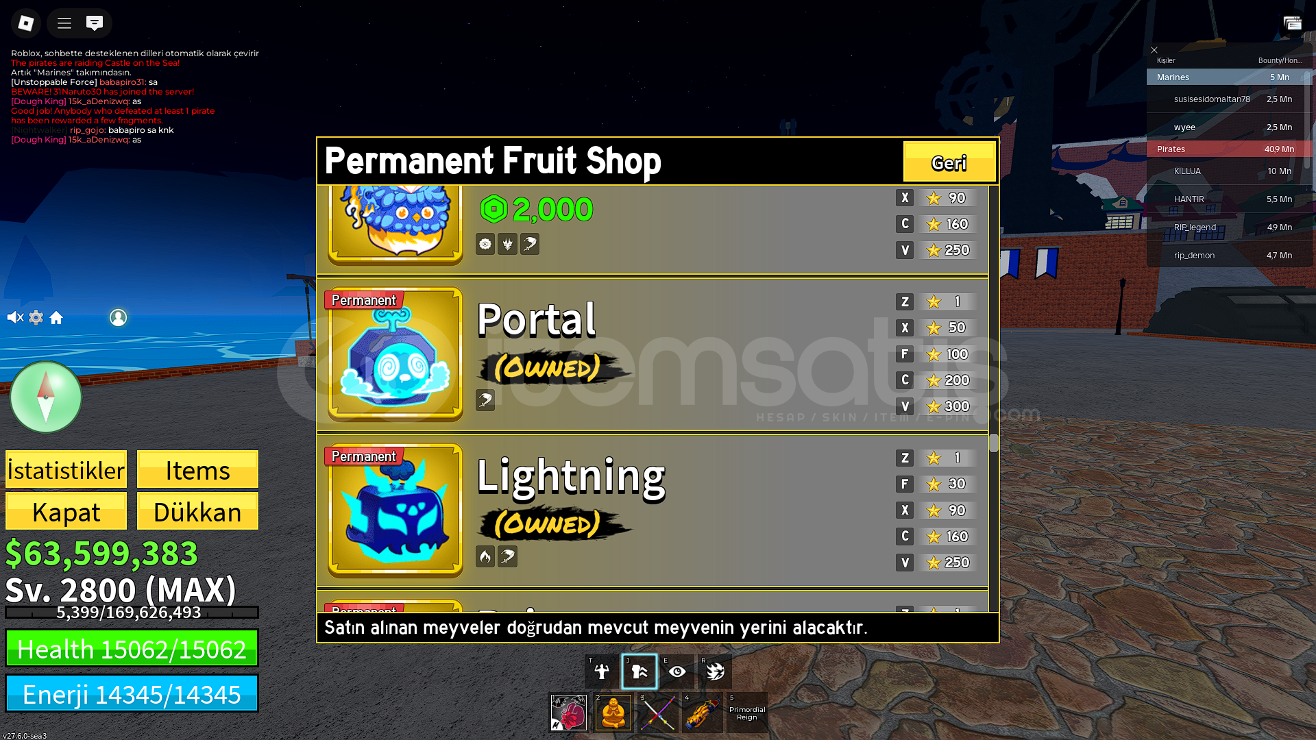 HER OYUNDA BİŞE VARDIRBLOX FRUİTSPERM DRAGON WEST TOKENPERM KİTSUNEPERM DOUGHPERM LİGHTNİNG PURPLE VE YELLOW SKİNLİPERM PORTALPERM BUDDHA PERM ICE DARK BLADE V2 TÜM KILIÇLARDA FULL MASTERYDRAGON TRİDENT 550 MASTERY DRAGON STORM 500 MASTERY 60M PARA TÜM DÖVÜŞ SANATLARI 7M BOUNTY TÜM KILIÇLAR TÜM IRKLAR ANGEL FULL GEAR V4SHARK FULL GEAR V4 MİNK FULL GEAR V4GHOUL FULL GEAR V4CYBORG FULL GEAR V4DRACO V...