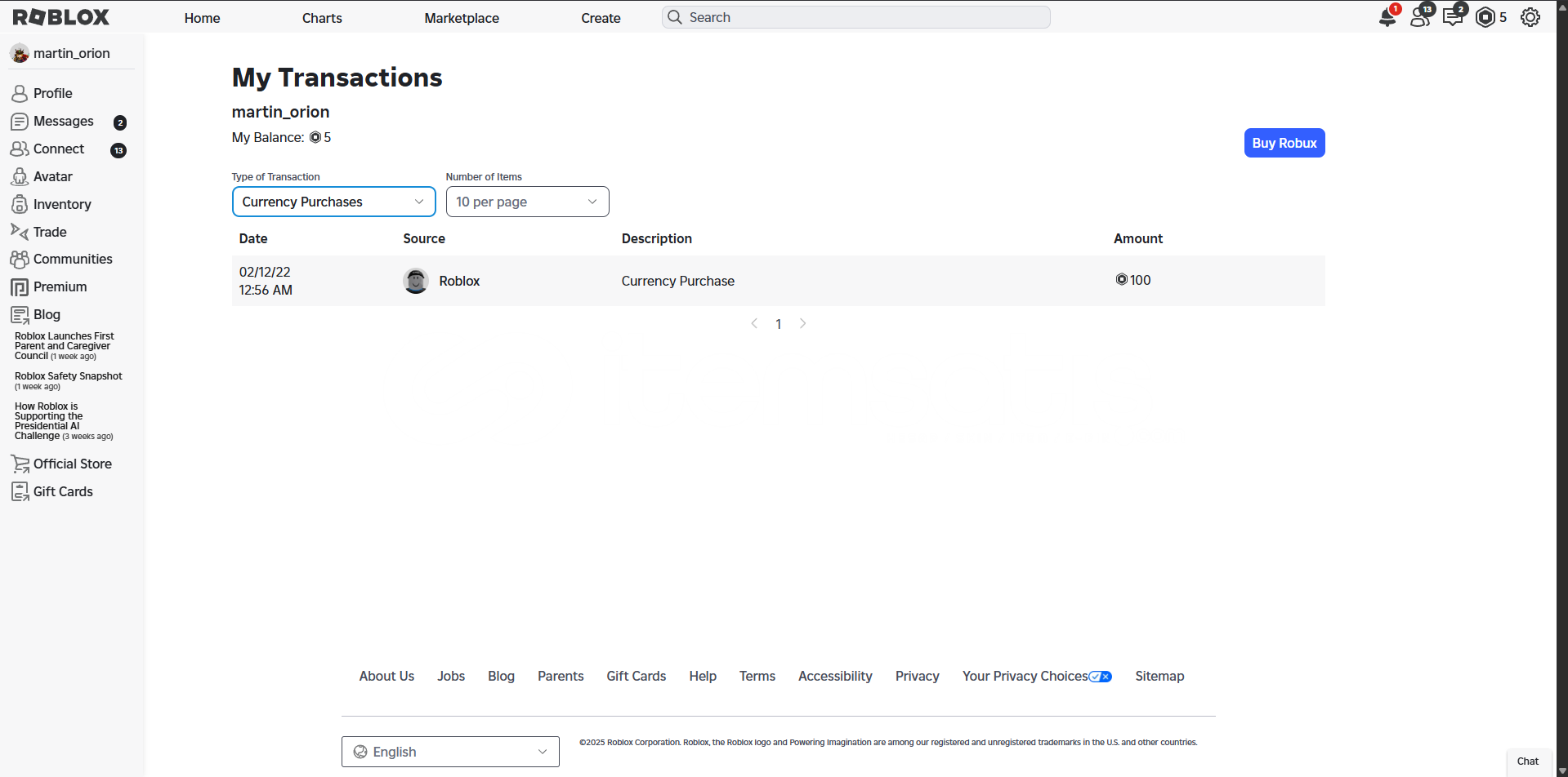 Hesaba 100 Robux yatırılmıştır. Mevcut 5 Robuxu vardır.