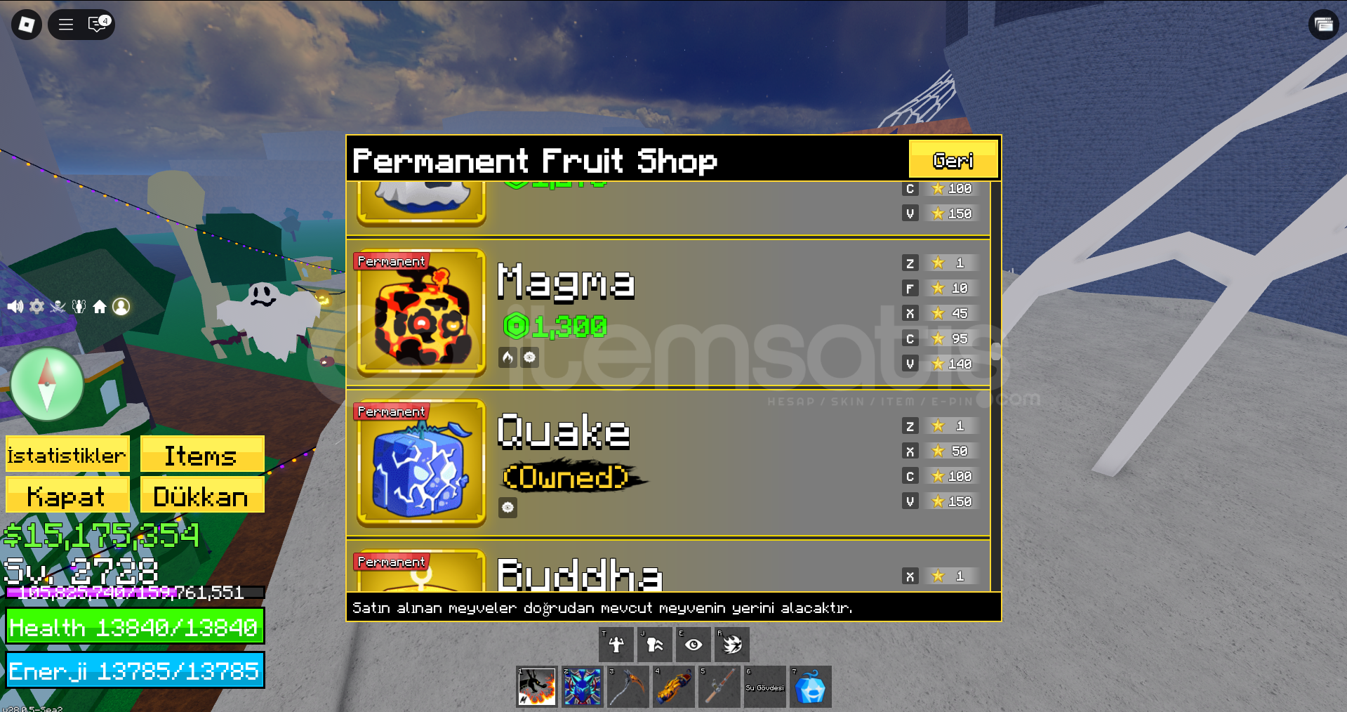 ✨ ÖNE ÇIKAN ÖZELLİKLER📈 Seviye: Tam 2.728 LVL AKTİF MEYVE KİTSUNE💎 Eşya Durumu: Full Gear Shark V3 💰 Nakit Miktarı: 15.000.000+ Cash 🔫 Kalıcı Güçler: Perma Quake ve Perma Rocket aktif durumda!🎮 PS99 Envanteri: Huge Pet dahil olmak üzere birçok değerli item mevcut!💲 Robux Yatırımı: Hesapta 4.000 Robux YATIRILMIŞTIR🔥 AÇIKLAMABu h...