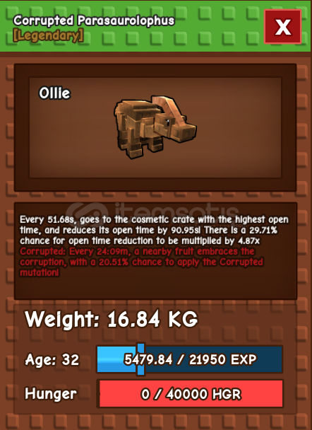 SEMI - HUGE CORRUPTED PARASAUROLOPHUSOYUNDA ARTIK BULUNMAYAN OLDUKÇA NADİR BİR MUTASYONA SAHİPTİR. KIRMIZI RENGİYLE VE ÜZERİNDEN ÇIKAN ATEŞİMSİ EFEKTLE DİKKAT ÇEKER.MAX AGE OLDUĞUNDA 44.10 KG'YE ULAŞIP SEMI - HUGE GRUBUNA GİRER.7/24 AKTİFİM, SATIN ALABİLİRSİNİZ. BİLDİRİM GELİYOR DİREKT DÖNÜŞ YAPARIM.