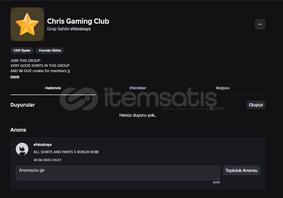 Grupta Güncel Olarak 1.109 Üye Vardır.Grupta 125 Robux Bulunmaktadır . (Pendingtedir.)Grup Hafif Gelirli Bir Gruptur.Grupta 13 Adet Shirt Vardır.Grupta 7 Rol Vardır.Grupta 2 Oyun VardırHızlı Teslimat.