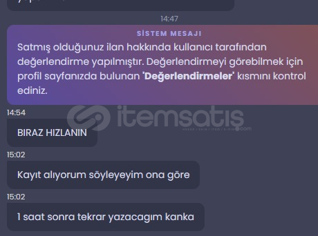 Güvenilirlik: Güv: 1/10 Memnuniyet: Mem: 2/10 İletişim: İlet: 1/10 Teslimat: Tes: 1/10