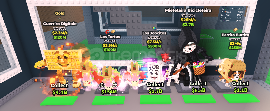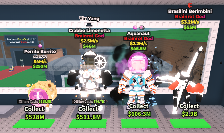 Bu base de brainrot god ve secret değerinde olan 14 brainrot vardır:1-)Perrito Burrito 4 M/s (bubblegum)2-)Yin Yang La Cucaracha 4.9M/s (orcalero eventli)3-)Rainbow Los Tralaleritos 5M/s 4-)Los Mobilis 22M/s5-)Yin Yang La Cucaracha 10.6M/s ( taco, niyanino,mexico ve glitch eventli)6-)Yin Yang Karkerkar Kurkur 3.3M/s (dul dul eventli)7-)Gold Gueriro Digitale 2.3M/s (bombardiro eventli)8-) Los Tortus 3.5M/s (taco ve yengeç eventli)9-)Los Jobcitos 7.5M/s (glitch eventli)10-)Mietete...