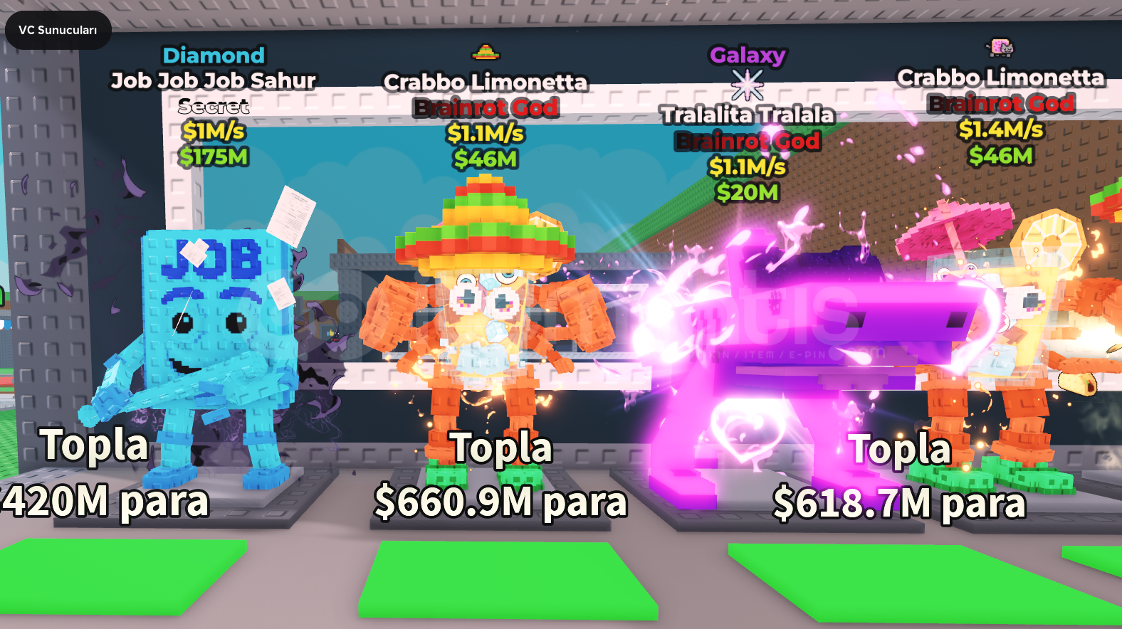 içindekiler= 1 Adet 1.4M/S Crabbo Limonetta (Nyan cat Effect) 1 Adet 1.1M/s Crabbo Limonetta (Mexico Effect) 1 Adet 1.1M/s Tralalita Tralala (Galaxy+Shiny Effect) 1 Adet 1M/s Job Job Job Sahur (Diamond)