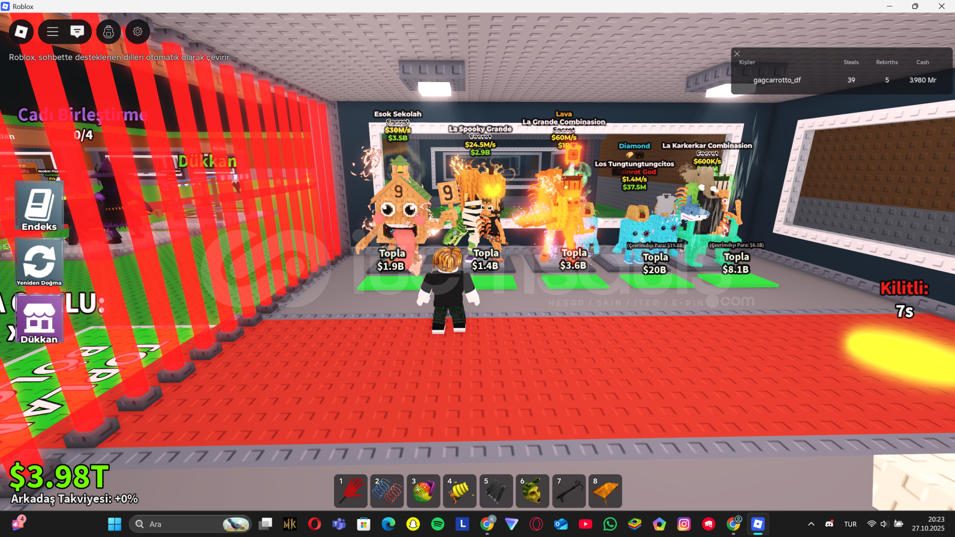 robloxun icinde bulunan steal a brainrot oyunun icindeki 3 cok iyi secret uygun fiyata 30m/s esok sekolah ve 24.5m/s la spooky grande ve 60m/S lava la grande combinasionu satıyorum private farketmez sizin varsa olur sizde priviniz yoksa hesabınızdaki iyi şeylerinizi yan hesabınıza bosaltıp gelebilirsiniz sormak istediğiniz bir şey olursa almadan önce sorun
