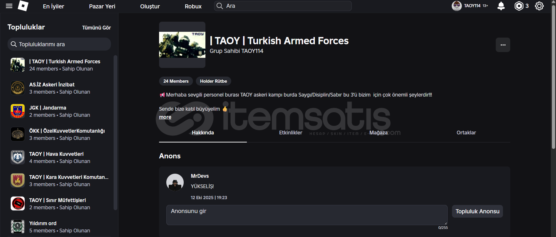 TAOY | Turkish Armed Forces Adlı askeri kampımızı bazı sebeplerden dolayı satılığı çıkartıyoruz aşağıda linkini verdiğimiz tüm gruplar tarafınıza teslim edilecektir. İNDİRİM VE PAZARLIK PAYI YOKTUR ZARARINA SATIYORUZ!Aşağıdaki gruplar teslim edilecektir.https://www.roblox.com/tr/communities/34445975/TAOY-Turkish-Armed-Forces#!/abouthttps://www.roblox.c...