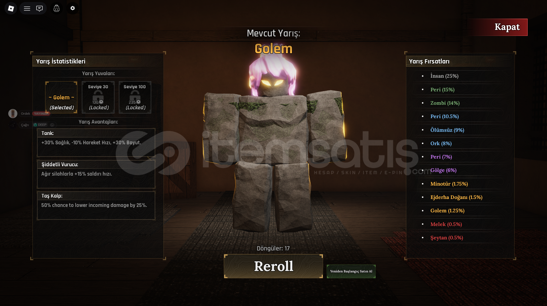GOLEM+30 Saglık -10 Haraket hızı +30 BoyutAgır silahlarla +15 saldırı hızı.100/50 Sans İle 100/25 Daha fa...