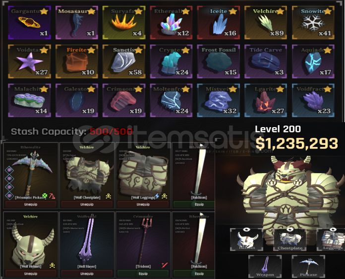 İlan görselinde de göründüğü gibi hesap full + fulldur.Full set wolf armouru vardır.Sınırlı sayıdaki silah mevcuttur ( 162 DMG , 0.50 AS )Oyundaki en iyi kazma olan Prizmatik Kazma mevcuttur.Leveli MAX (200) 'tırBirsürü değerli maden vardır ( 333333 te 1 olan maden dahil )------------------------------------------------------------The Forge harici çoğu popüler oyunda yüksek seviyededir.DAHA...