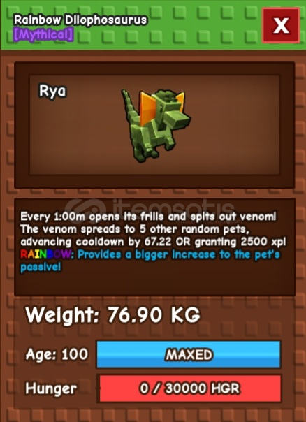 Grow A Garden Rainbow Titanic Dilophosaurus / Dilo1 Dakika Cooldownu vardır, petlere xp kasmak için birebir baya hızlı.Her 1 Dakikada 5 tane orb fırlatır orbların tanesi 2.5k xp veriyor.Almadan önce lütfen yazınız en yakın zamanda cevap vermeye çalışacağım.