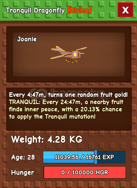 Mutasyonu=TranquilYaş=28kg=4.28Oyunun en iyi yumurtasından %1 şansla çıkıyor hem özelliği güçlü hem ucuz hemde çoğu oyuncu tarafından seviliyor tavsiye ederim
