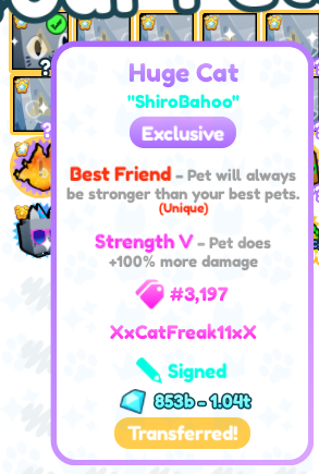💎 İlan Detayı:Pet: Huge Cat (PSX sürümü)Durum: Transferred (PS99'a aktarılmış durumdadır, bu yüzden PSX koleksiyonu yapanlar için uygundur).Özellik: Shirobahoo imzalıdır. Kendisinin eski moderatörü olduğum için petin geçmişi ve orijinalliği %100 güvenilirdir.🚚 Teslimat Bilgileri:Yöntem: Mailbox veya Trade yoluyla teslim edilir.Nasıl Alınır? Sat&#...