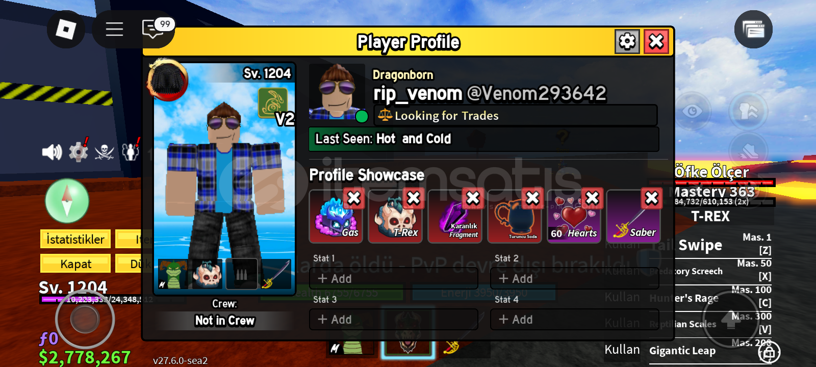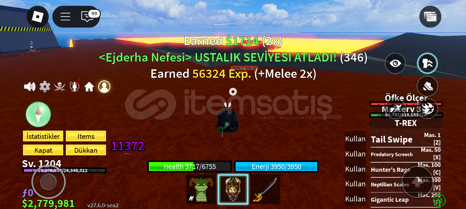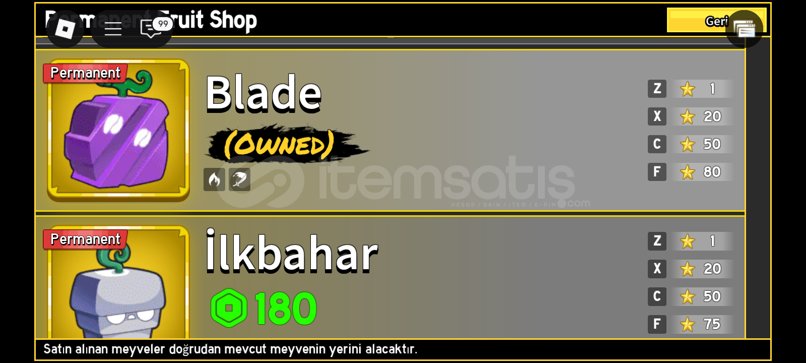 Not:Bu hesabın pahalı olma sebebi 2 gamepasse sahip olması ve storesinde gass olmasıdırBu hesap 1200 leveldir storasinde gass vardır perm bladei vardır trex 350 masterydir kasmalık hesaptır rabbit v3 ve 500k para bulunmaktadır