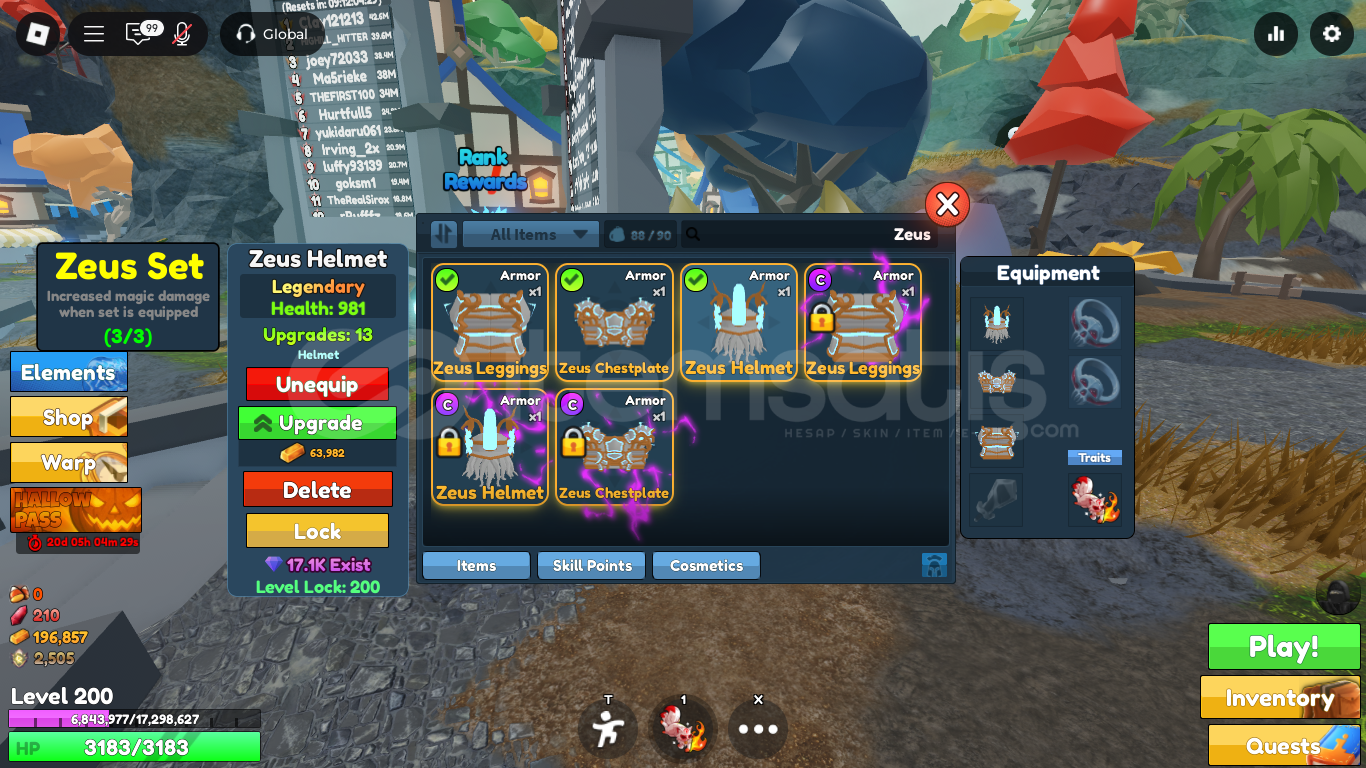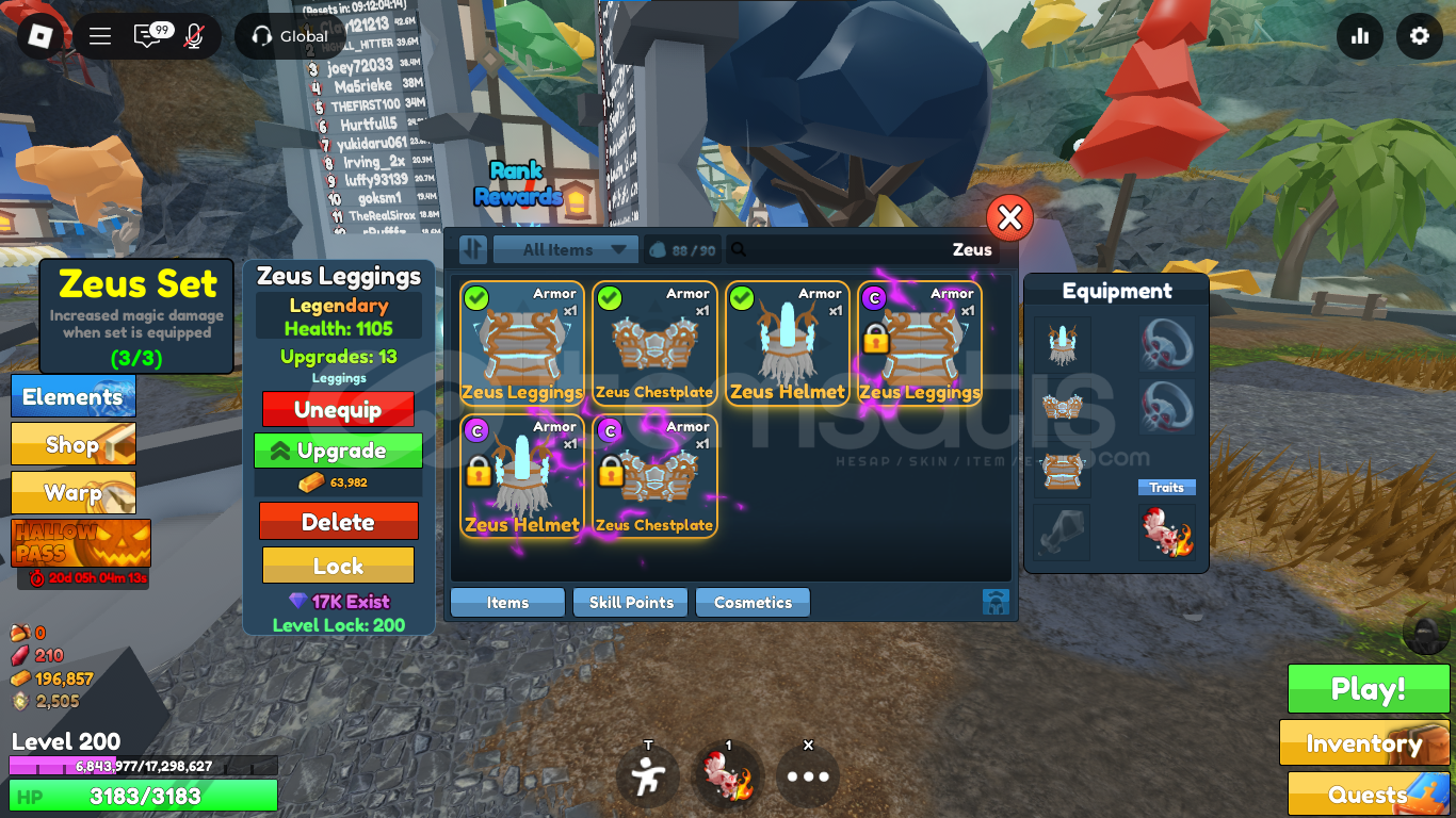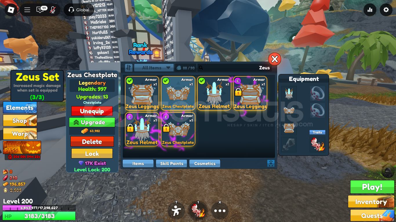 🔥 Set İçeriği:├─ Zeus Helmet → 981 HP├─ Zeus Chestplate → 997 HP└─ Zeus Leggings → 1105 HP❤️ Toplam HP: 3083💎 Nadirlik: Legendary⏱️ 17:00-24:00 saatleri arasında verilen siparişler daha hızlı teslim edilir.