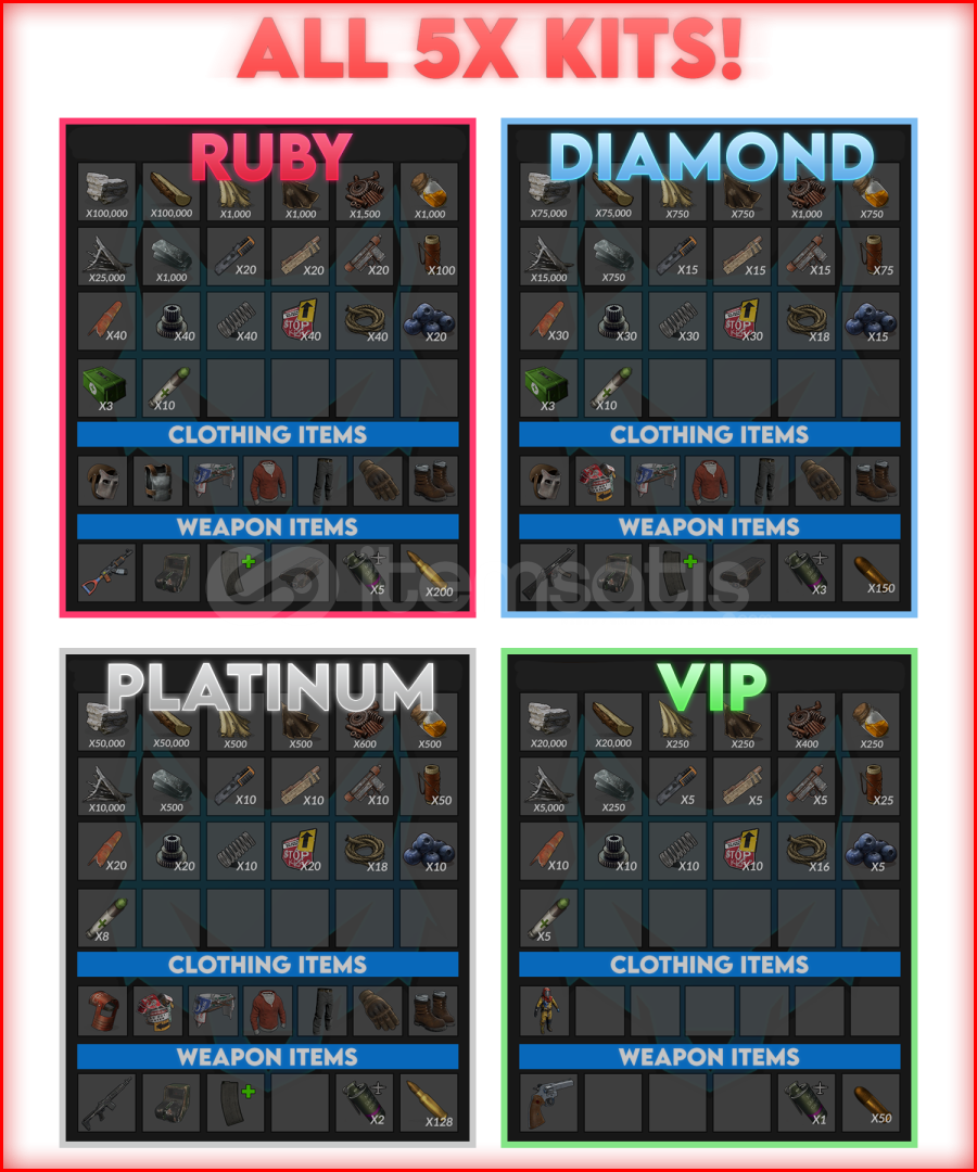 • 💎 Ruby Kit – En üst seviye kaynaklar, zırh setleri ve silahlar
