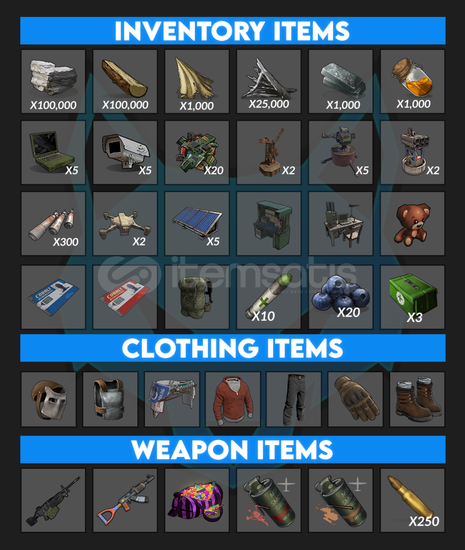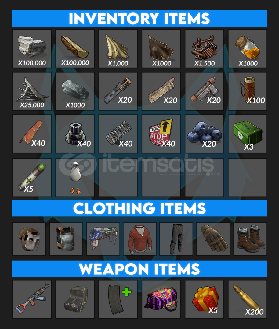 🔹 İçerikte yüzbinlerce kaynak, tam set zırhlar, güçlü silahlar, cephaneler, medikler ve inşaat kolaylıkları bulunur.