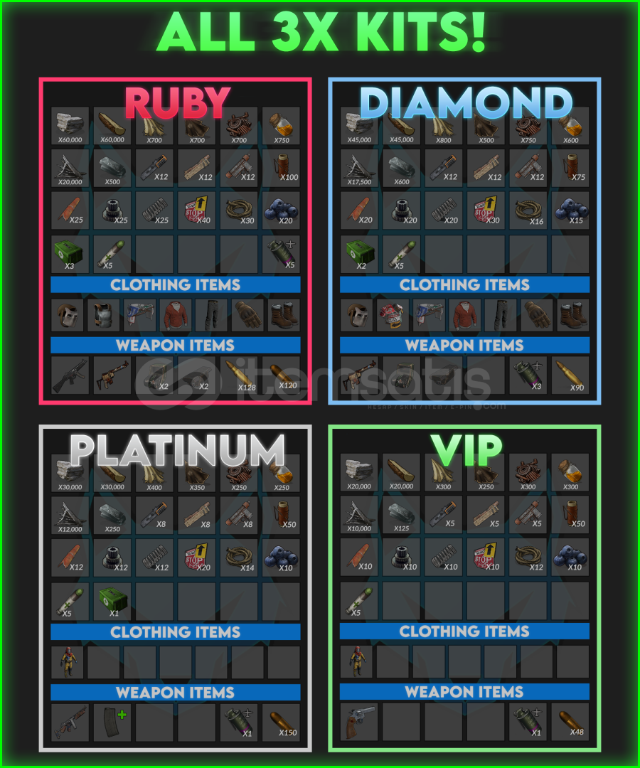 🎁 Wipe’a Özel Tüm VIP & Özel Kitler – Tek Seferlik Teslimat 🎁💳 125 TL ile bu wipe boyunca sunucudaki tüm VIP ve özel kitlerin tamamını tek seferde al! Kitleri biz sizin adınıza çekeceğiz ve hepsini tek pakette teslim edeceğiz.📦 İçerikte Olan Kitler:💎 Ruby Kit – En üst seviye kaynaklar, zırh setleri ve silahlar💠 Diamond Kit – Güçl&...