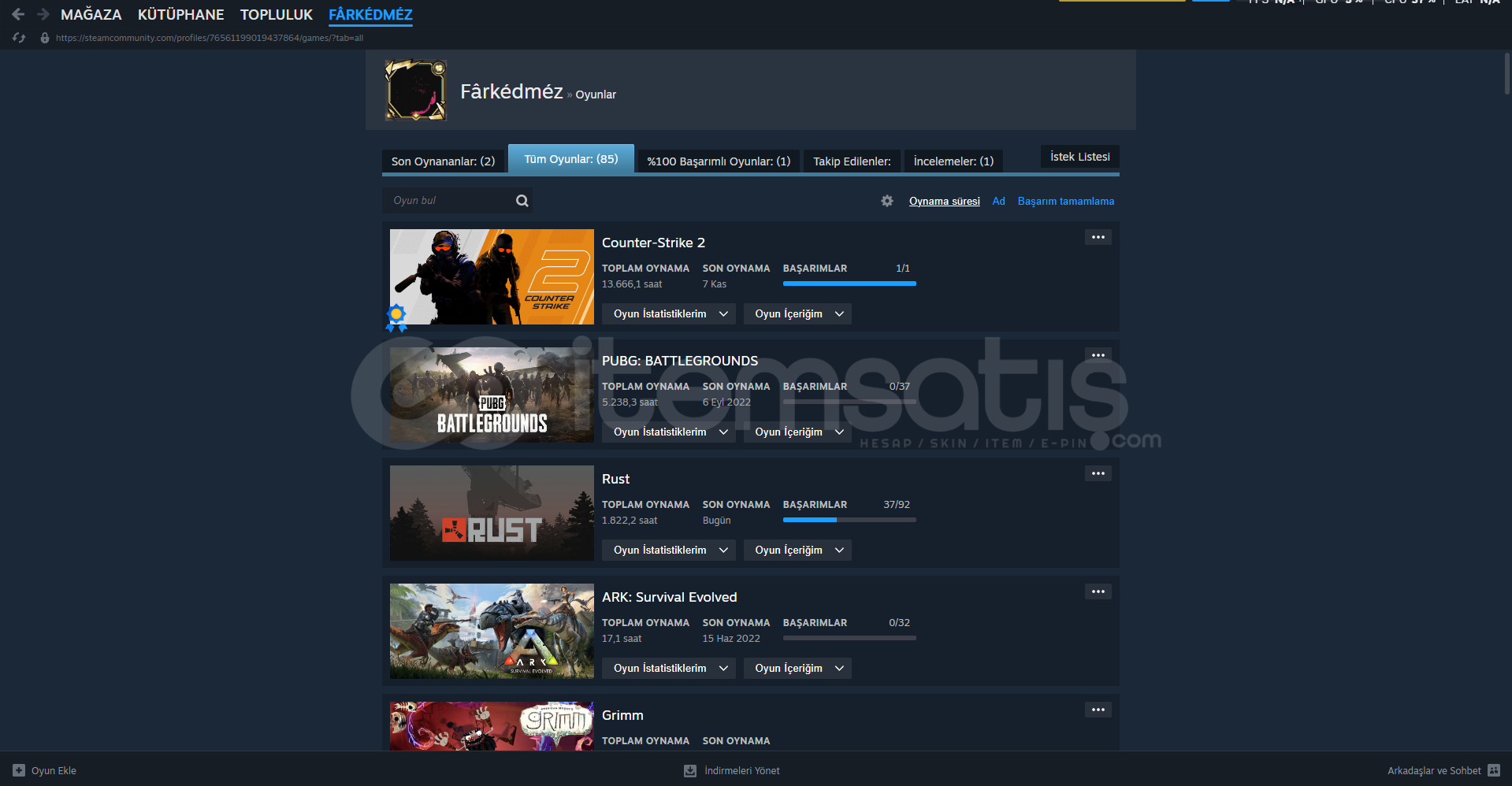 Counter-Strike 2 13.666,1 saatPUBG: BATTLEGROUNDS 5.238,3 saatRust 1.822,2 saat+ 85 Oyun ile birlikte Hesap bu şekildedir detaylı bllgi i&cc...