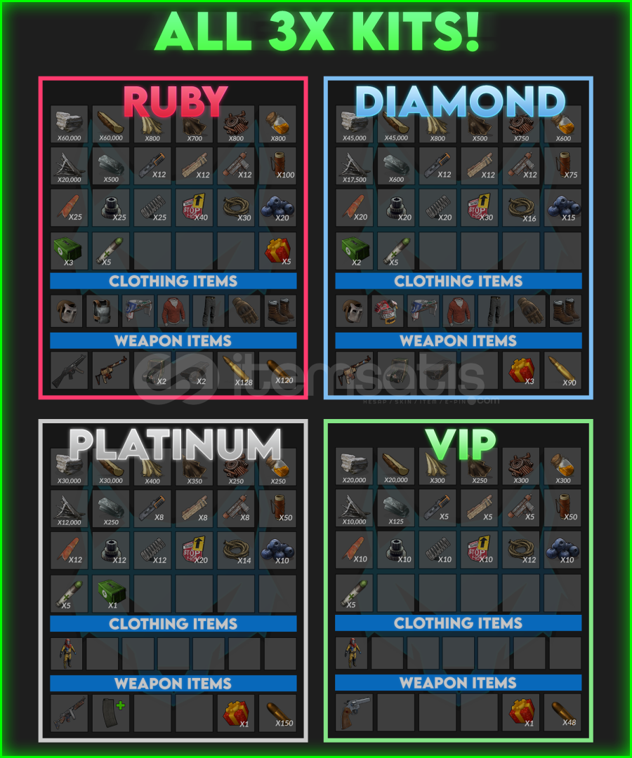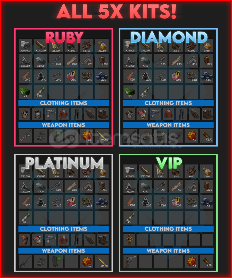 • 💎 Ruby Kit – En üst seviye kaynaklar, zırh setleri ve silahlar