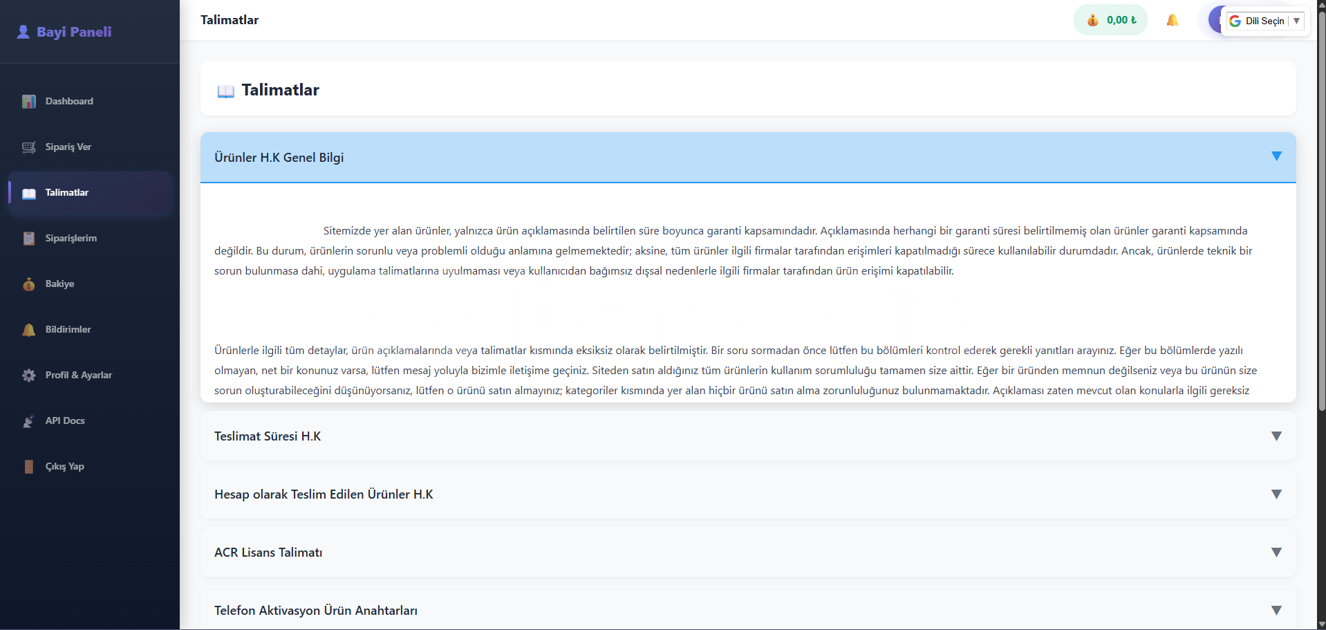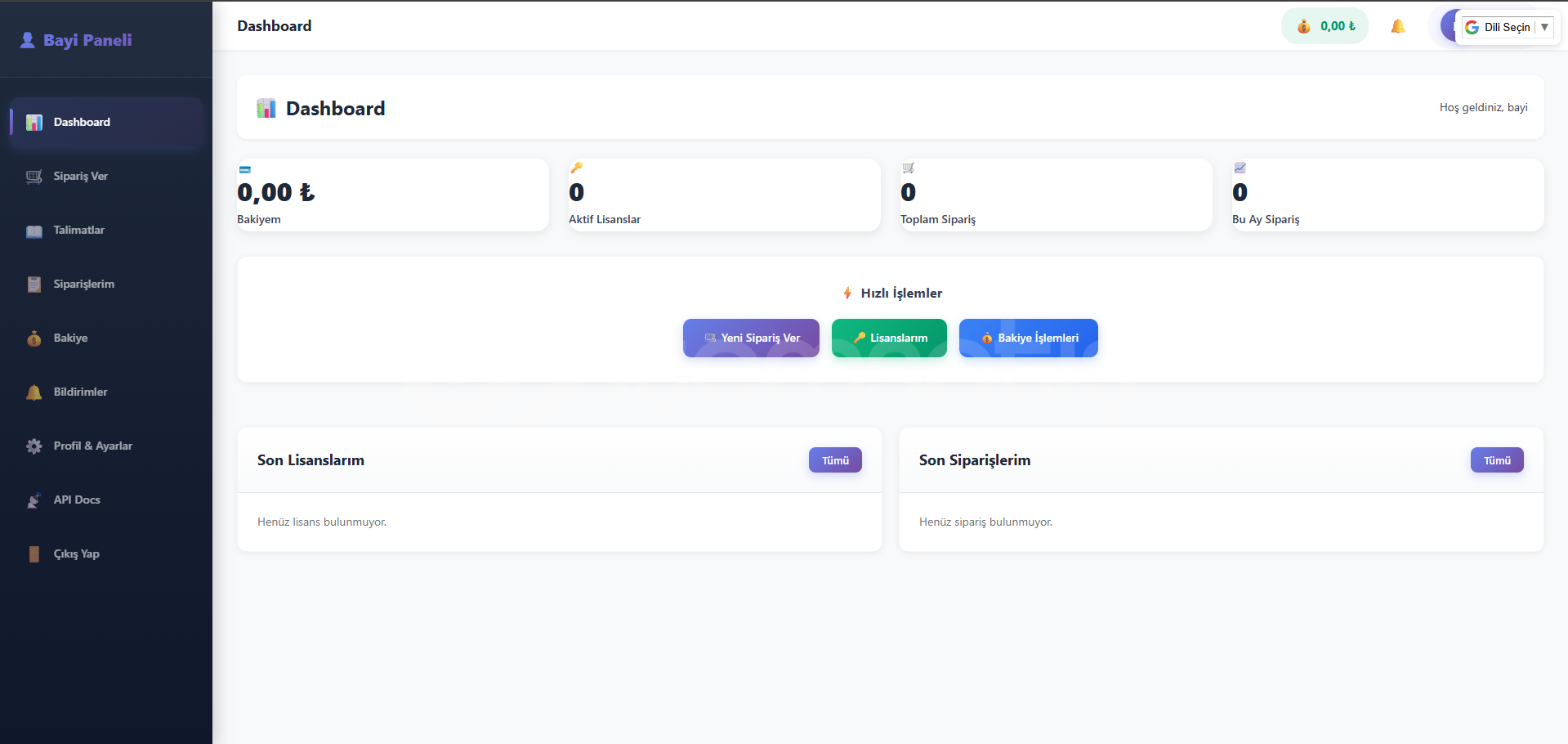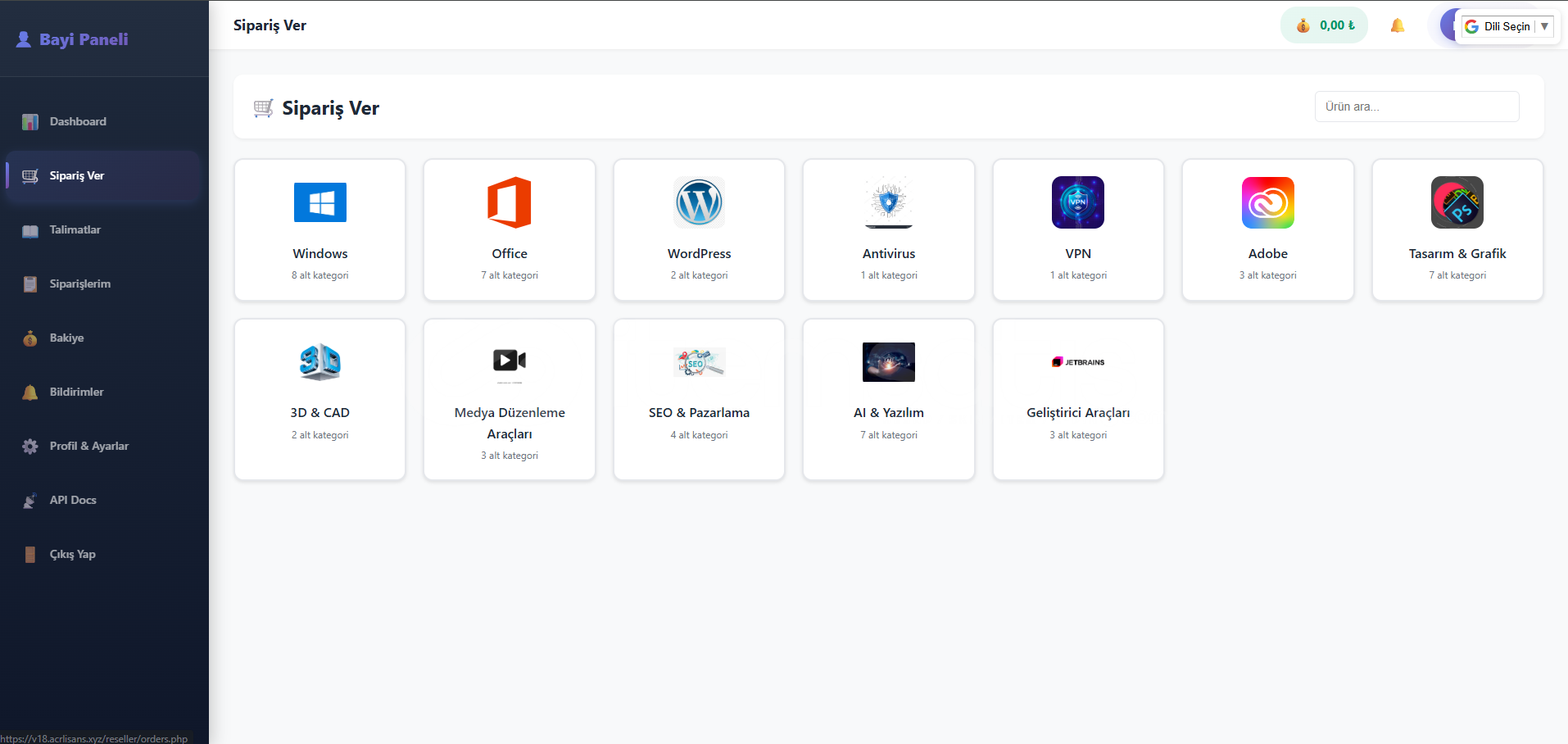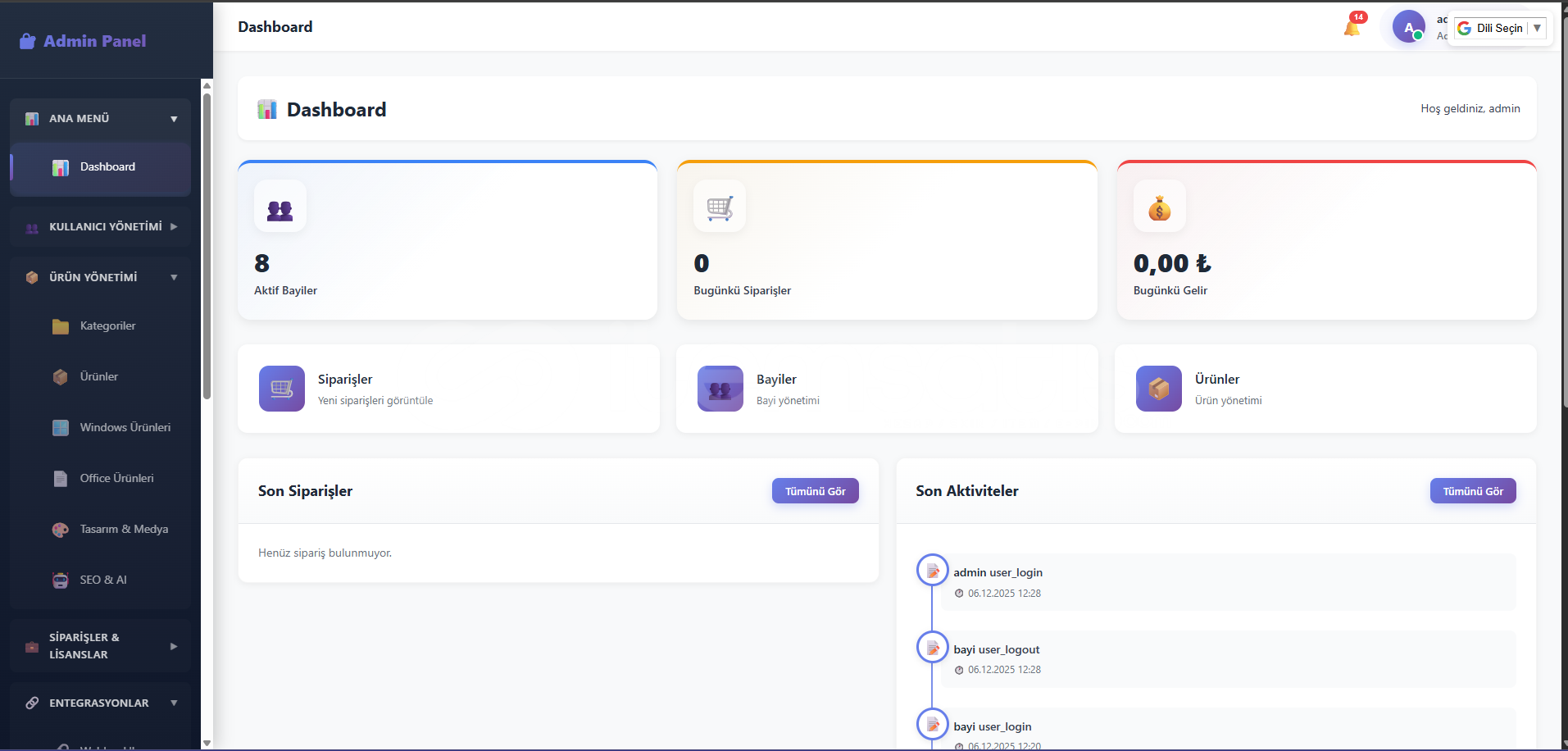 https://v18.acrlisans.xyzbayi bayi123Panel özellikleri için uzaktan gösterim yapılabilmektedir.📦 ANA ÖZELLİKLER🔐 Güvenlik 👥 Kullanıcı yönetimi 📦 Ürün ve erişim yönetimi 🛒 Sipariş sistemi 💰 Cüzdan sistemi 🔗 Webhook sistemi 📊 Raporlama ve analitik 📡 REST API 🌐 Çoklu dil desteği 🎨 Tema yönetimi 💾 Yedekleme ...