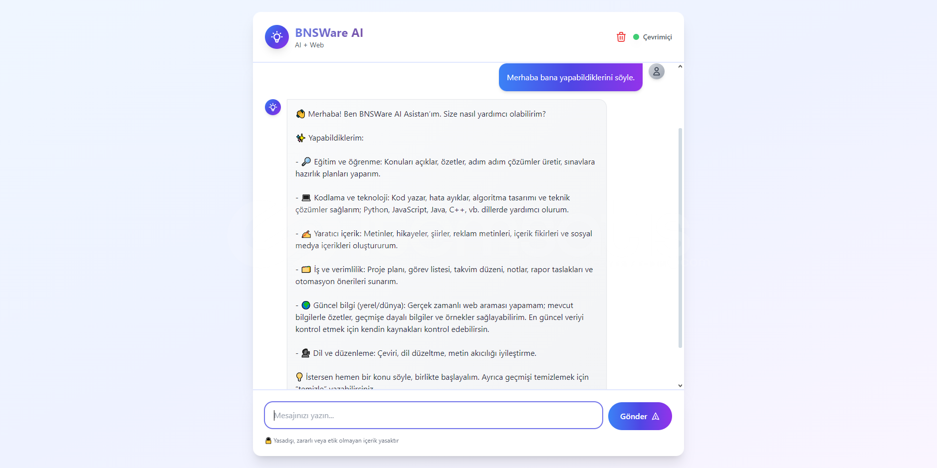 • Türkçe Sohbet: Doğal dilde konuşma, akıllı cevaplar