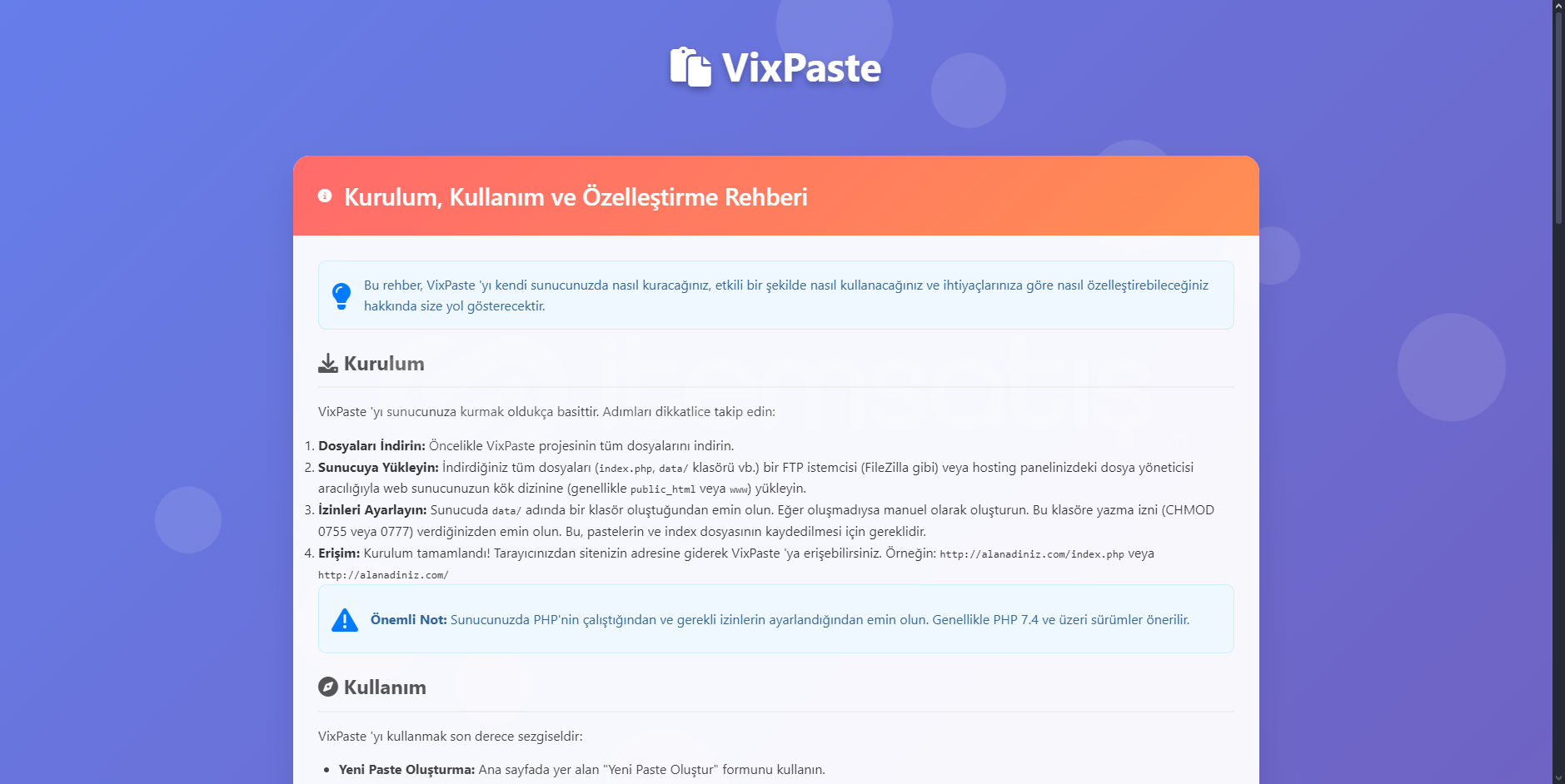 Kurulum ve özelleştirme rehberi: Ürünle birlikte gelen detaylı HTML dökümanı, VixPaste’i kendi sunucunuza nasıl kuracağınızı ve ihtiyaçlarınıza göre nasıl özelleştirebileceğinizi adım adım anlatır. Her aşama açık şekilde gösterildiğinden, teknik desteğe gerek kalmadan hızlıca kurulum yapabilirsiniz. Ayrıca, sınırsız kullanım lisansı sayesinde ürünü özgürce kullanma hakkına sahip olursunuz.