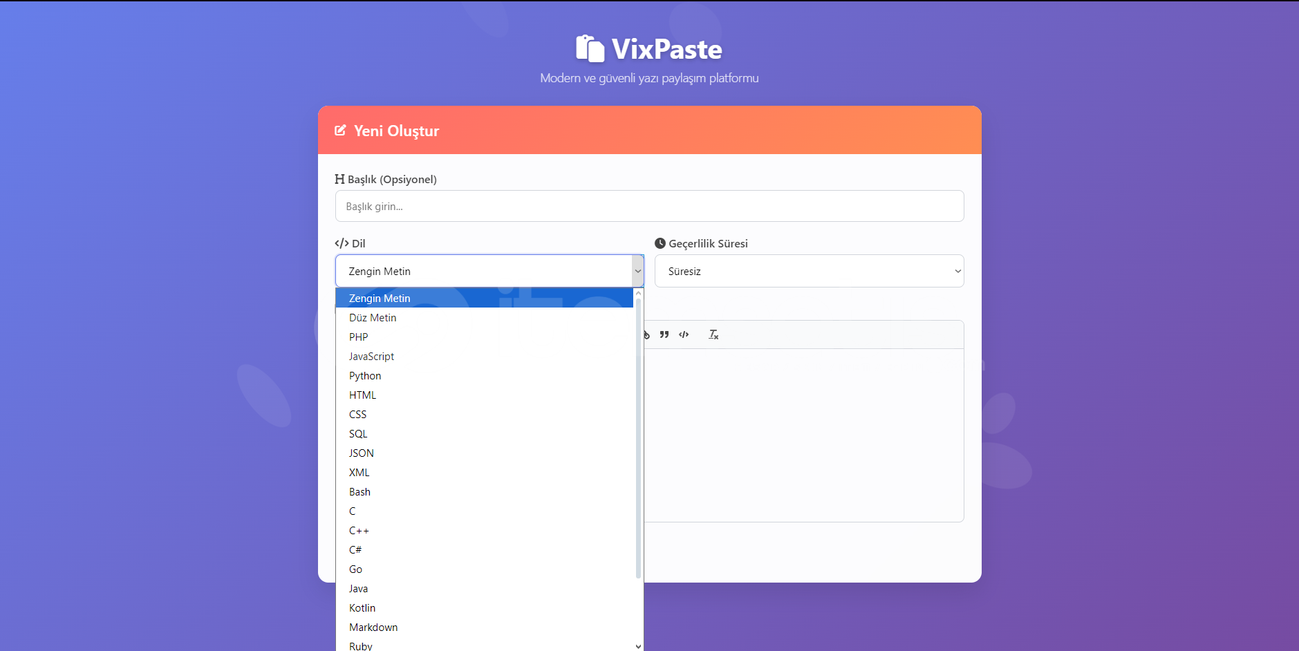 VixPaste, metin paylaşımında geniş bir dil desteği sunar. Menüden Zengin Metin seçerek biçimlendirilmiş yazılar yazabilir veya JavaScript, Python, HTML, JSON, XML gibi popüler programlama dillerinden birini seçerek kod paylaşabilirsiniz. Her içerik türü için uygun düzenleyici araçları mevcuttur.