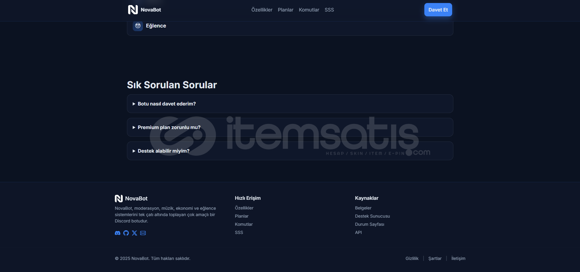 Discord botun için modern ve tamamen özelleştirilebilir bir Landing Page (tanıtım sitesi) şablonu.