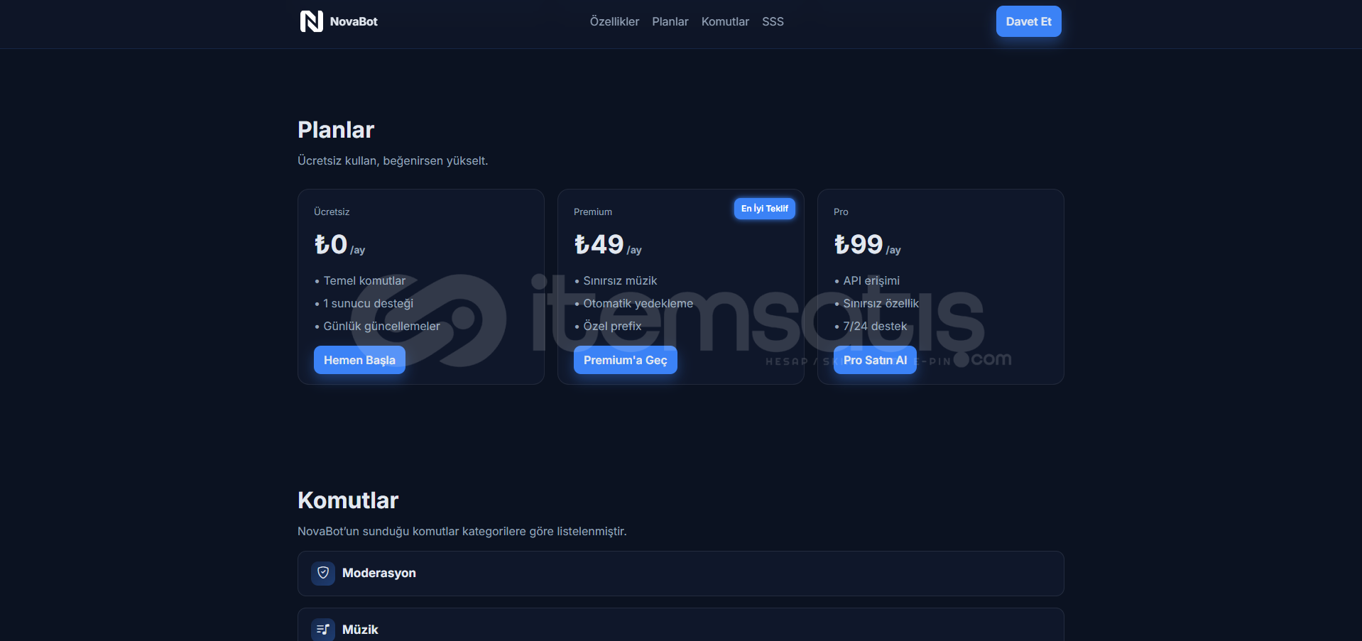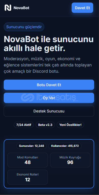 Discord botun için modern ve tamamen özelleştirilebilir bir Landing Page (tanıtım sitesi) şablonu. HTML, CSS ve JavaScript tabanlıdır — herhangi bir framework veya kurulum gerektirmez. Tüm renk temaları, logolar, ikonlar ve yazılar JSON dosyası üzerinden kolayca değiştirilebilir.Tasarım tamamen responsive (mobil uyumlu) olarak hazırlanmıştır ve her ekran boyutunda düzgün ...
