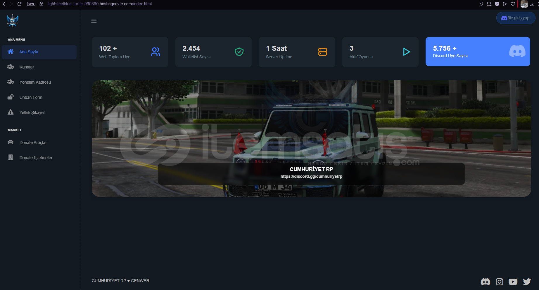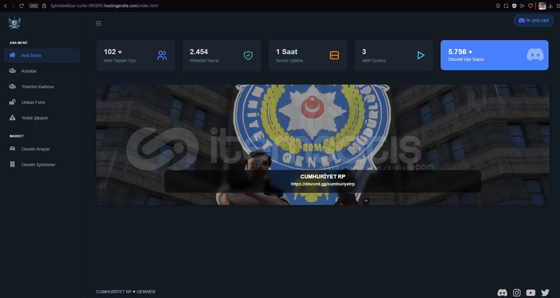 Cumhuriyet RP'nin internet sitesinin satışı. https://lightsteelblue-turtle-990890.hostingersite.com/Sitenin demo sürümüne bu yukarıdaki linkten bakabilirsiniz.Fiyatını hakeden fiyat performansı ve işinizi fazlaca görücek bir site. Kaliteli basit arayüz ve kullanışlıdır.Fivem sunucunuz için mecburen lazım.DETAYLI BİLGİ İÇİN BANA YAZABİLİRSİNİZ.