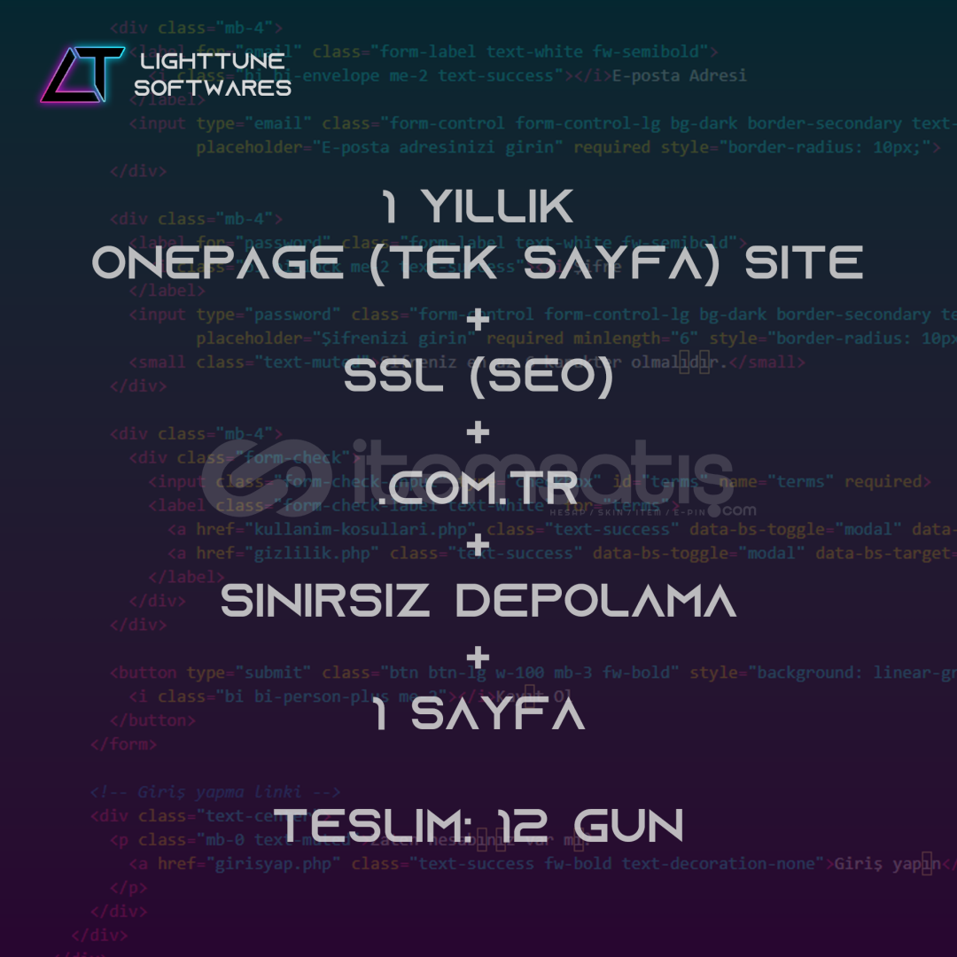 1 Yıllık Hosting ve Domainİstediğiniz .com ya da .com.tr uzantılı domaininiz.1 Yıllık SEO/SSL Güvenlik sertifikasıSınırsız Depolama ve Trafik1 Sayfa (En fazla 5)Teslimat süresi: 12-15 Gün