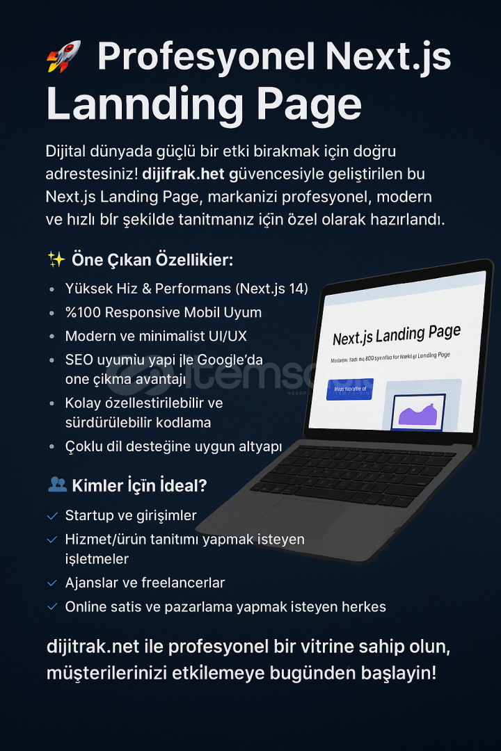 dijitrak.net güvencesiyle geliştirilen bu Next.js Landing Page, markanızı profesyonel, modern ve hızlı bir şekilde tanıtmanız için özel olarak hazırlandı.