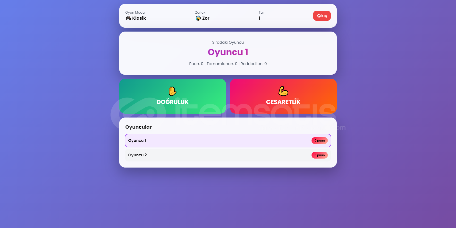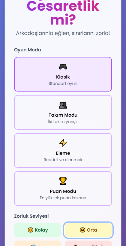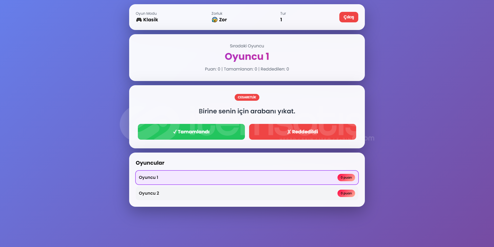 Arkadaşlarınla eğlenceli geceler geçirmek için hazırlanmış, 2025 kalitesinde modern ve gelişmiş bir parti oyunu! Tamamen mobil uyumlu, özelleştirilebilir ve profesyonel tasarıma sahip bu sistem, herhangi bir teknik bilgiye ihtiyaç duymadan kullanıma hazır.