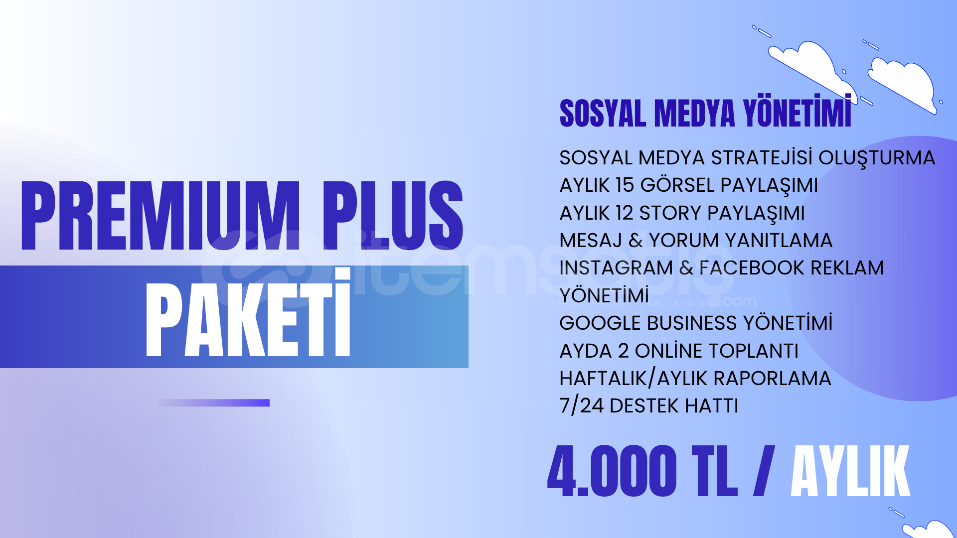 SOSYAL MEDYA STRATEJİSİ OLUŞTURMAAYLIK 15 GÖRSEL PAYLAŞIMIAYLIK 12 STORY PAYLAŞIMIMESAJ & YORUM YANITLAMAINSTAGRAM & FACEBOOK REKLAM YÖNETİMİGOOGLE BUSINESS YÖNETİMİAYDA 2 ONLİNE TOPLANTIHAFTALIK/AYLIK RAPORLAMA7/24 DESTEK HATTI4.000 TL / AYLIK