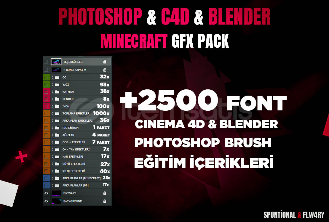 ⭐ EN KAPSAMLI Flw4ry & Spuntional MİNECRAFT Tasarım Paketi⭐Drive üzerinden teslim edilmektedir. Tüm dosyaların uzantısını ve içeriğini görebilirsiniz.⭐.PSD ile teslim edilecektir. Tüm sürümler ile uyumludur. Ekstra güncellemeler yapılacaktır. GÜNCEL DOSYA BOYUTU 3.5GB⭐Font + eğitim videoları + Brush Paketi + 3D Modeller ve dahası... işinize yarayacak her ...
