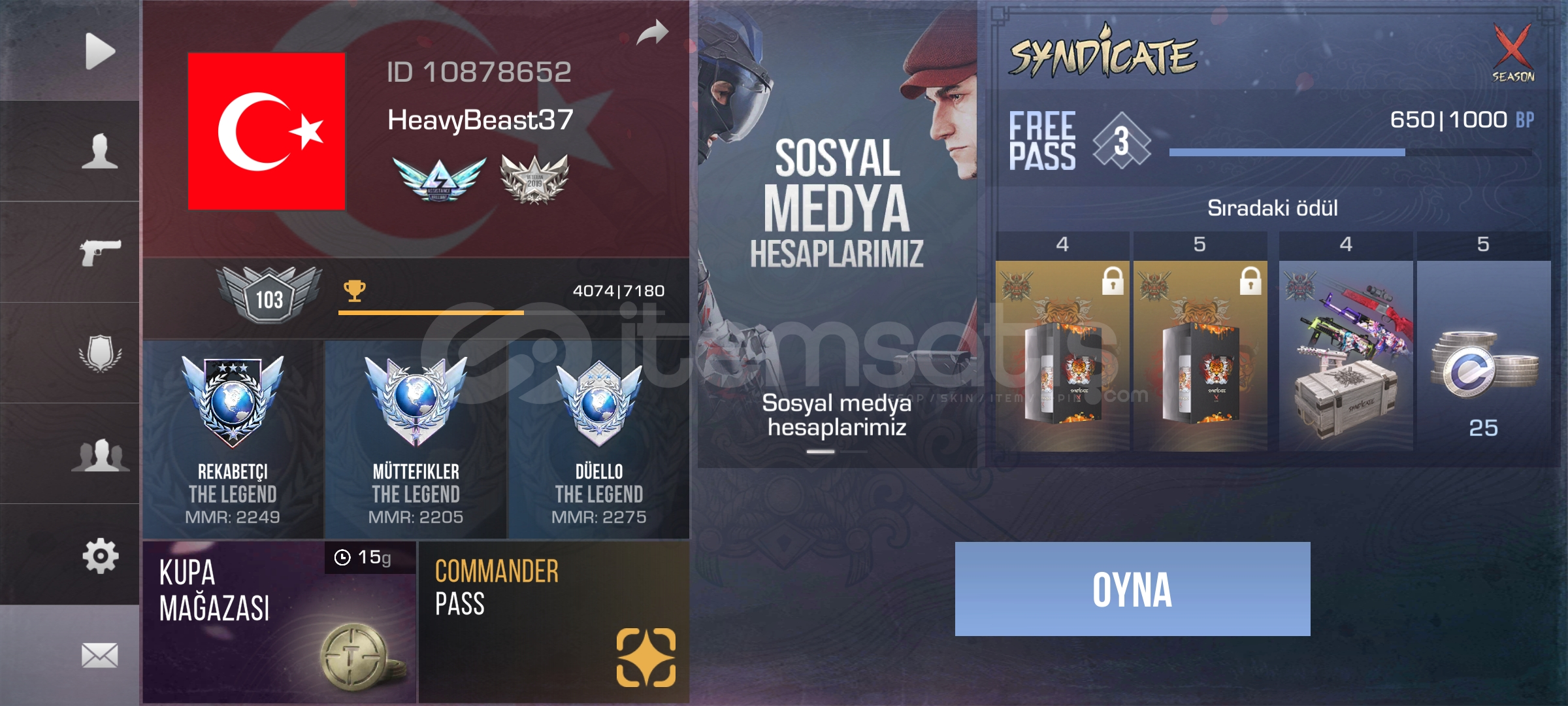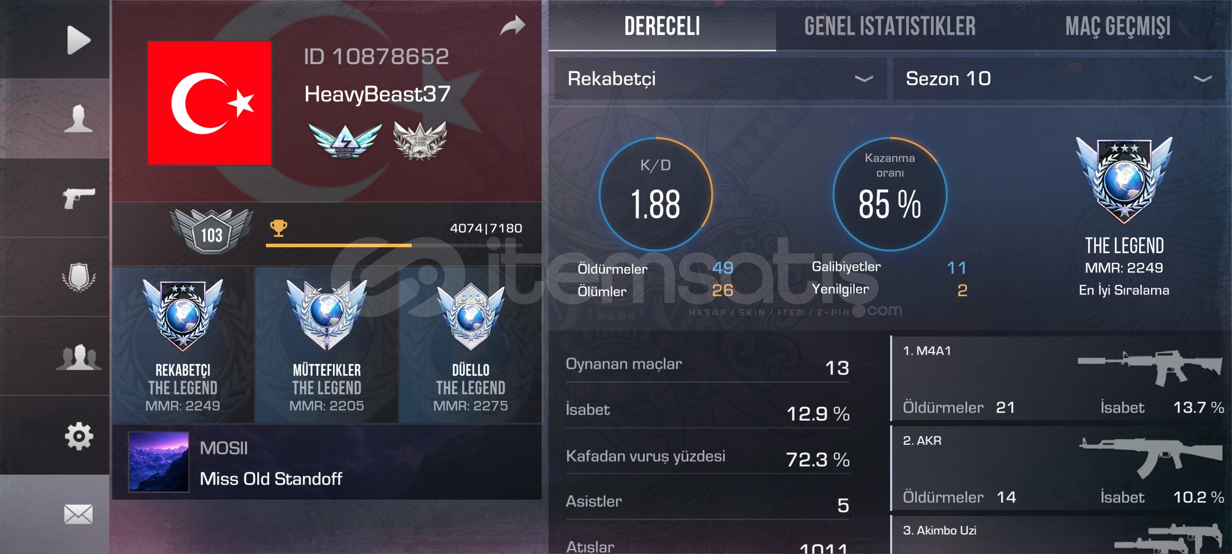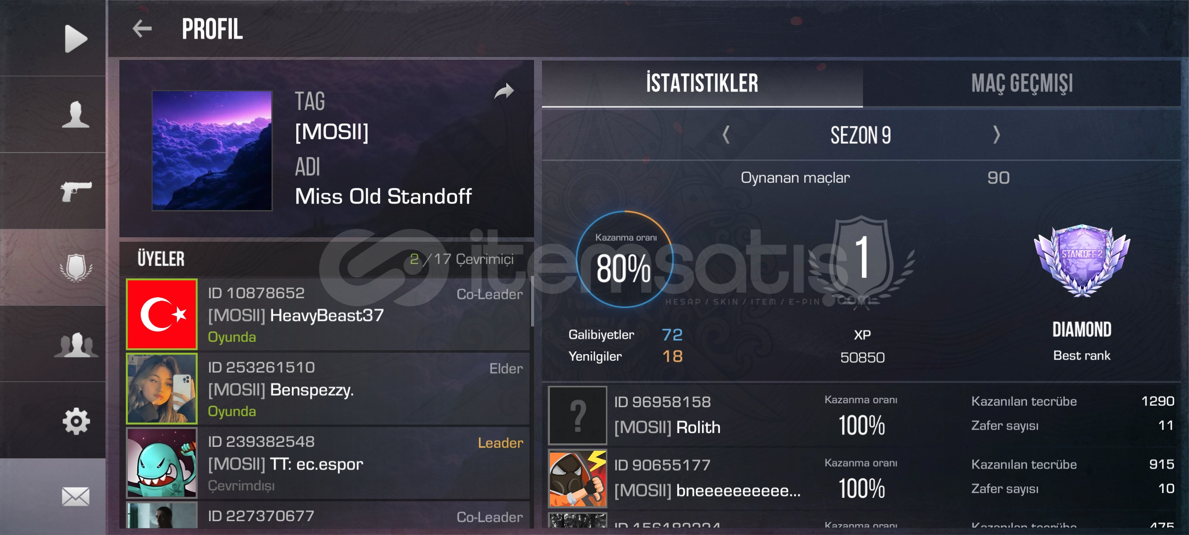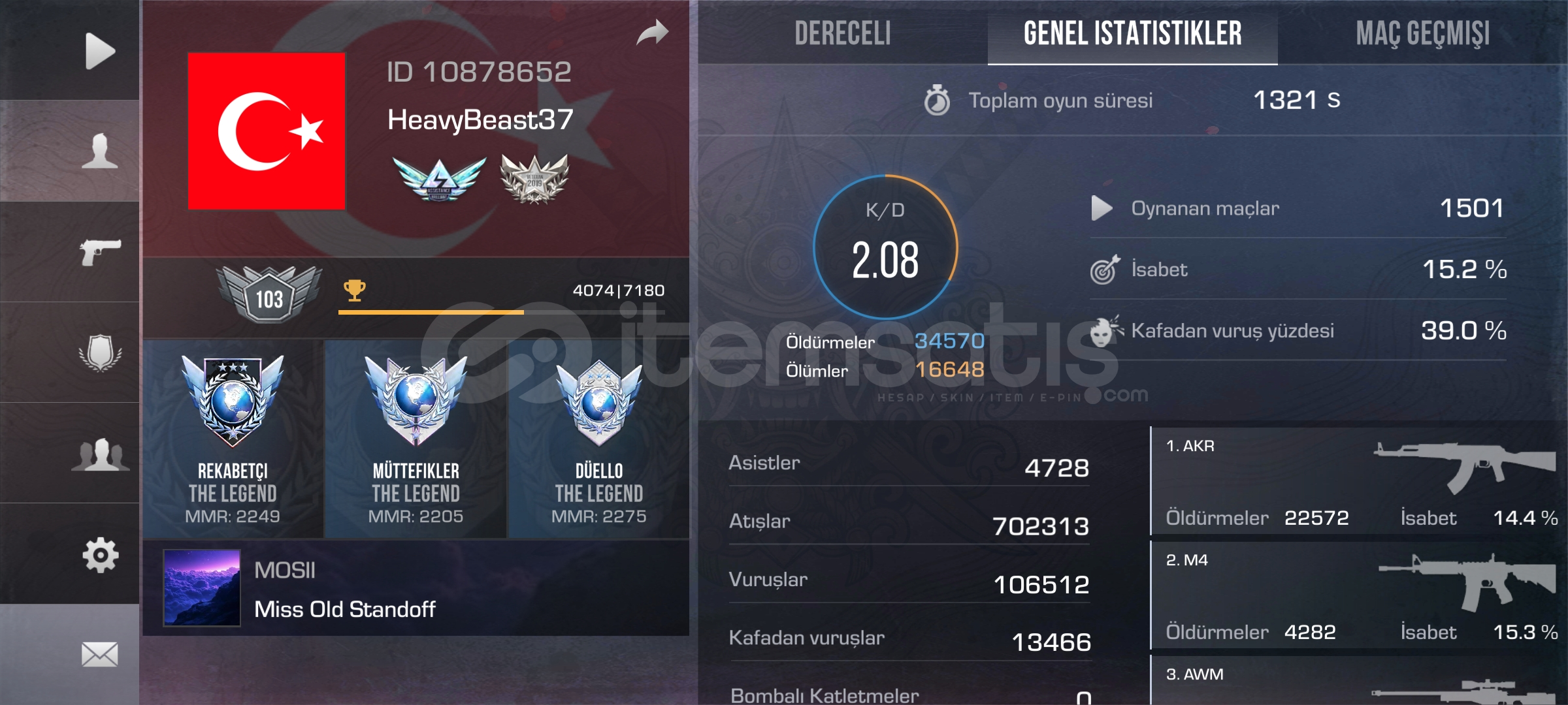 Hesapta Oyunun en nadir ve en değerli madalyası vardır 9. ve 10. Sezon triple legend dir. Envanter de değerli birşey yoktur. Hesaba dair ayrıntılı bilgi için fotoğrafta ID bulunuyor hesaba bakabilirsiniz. Klan 9. Sezon DIAMOND rank 10. Sezon ise Platinum 2 dir. 35 kişi kapasitesine kadar yükseltildi. Daha fazla bilgi için DM