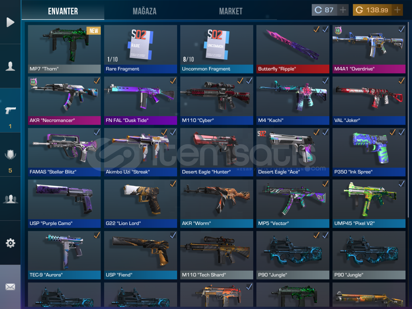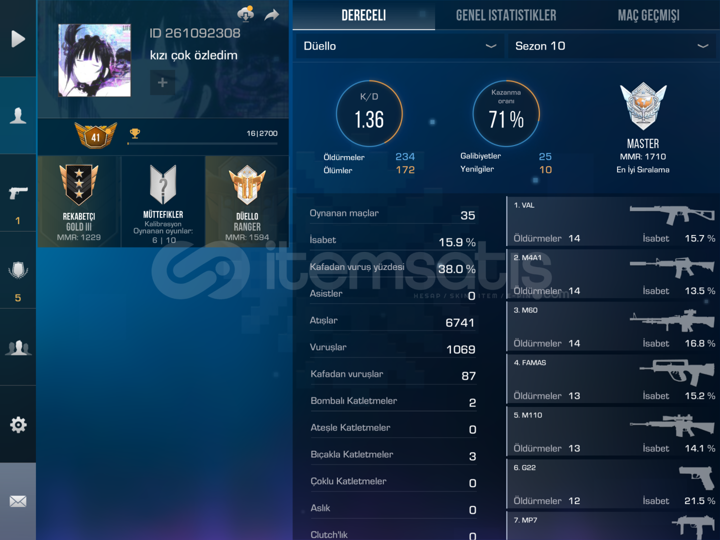 KELEBEK BIÇAĞI OLUP SİLAHLARDA GÜZEL SKİNLER VARDIR.DÜELLODA MASTER GÖRMÜŞ HESAP.KÜÇÜK HESABIM OLDUĞUNDAN SATIYORUM BU HESABA İHTİYACIM YOKTUR.FİYATTA PAZARLIĞIM VARDIR.