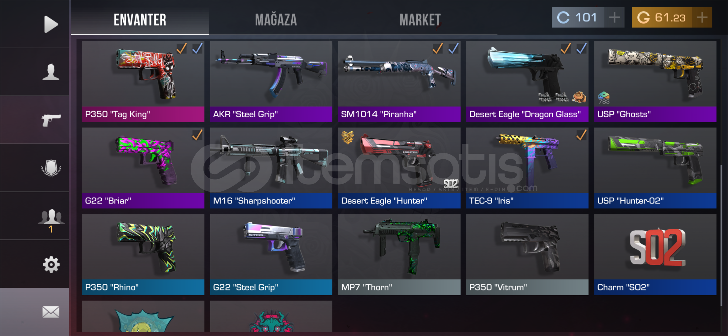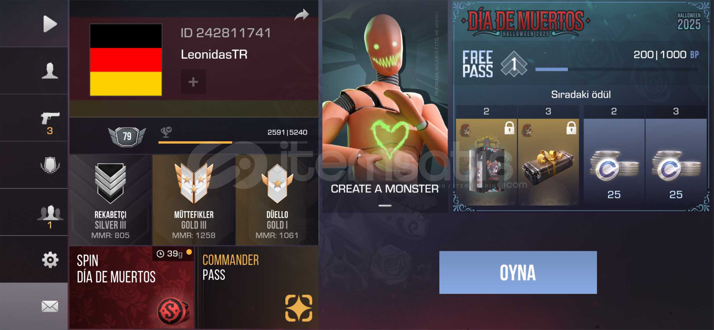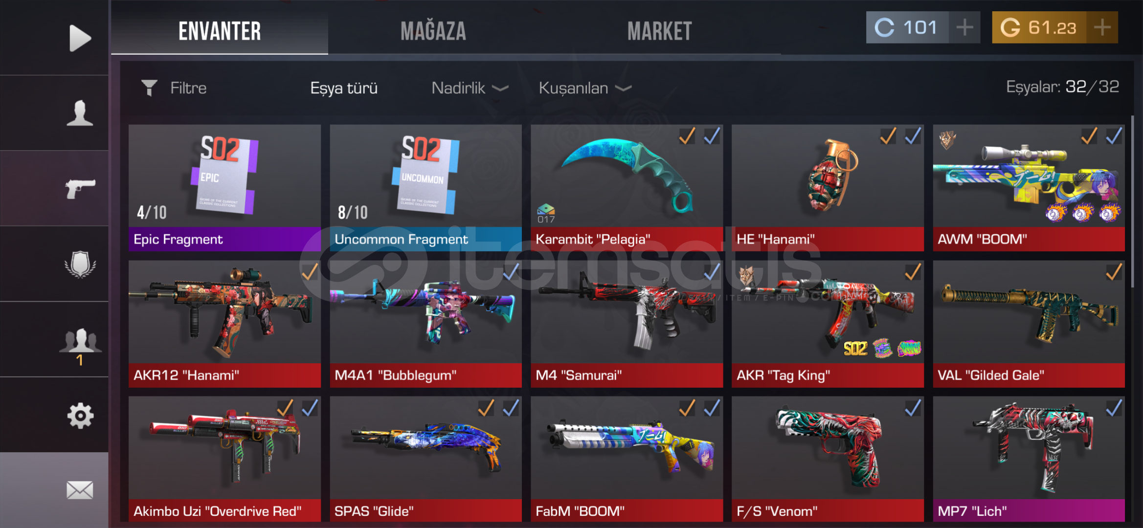 💎 Seviye: 79🏅 Rütbeler:Rekabetçi: Silver III (MMR 805)Müttefikler: Gold III (MMR 1258)Düello: Gold I (MMR 1061)🧩 Koleksiyon:32 farklı silah ve eşya17 adet Karambit “Pelagia”Özel silah kaplamaları: AKR12 “Hanami”M4A1 “Bubblegum”M4 “Samurai”AWM “BOOM”AKR “Tag King”Akimbo Uzi “Overdrive Red”F/S “Venom”MP7 “Lich”VAL “Gilde...