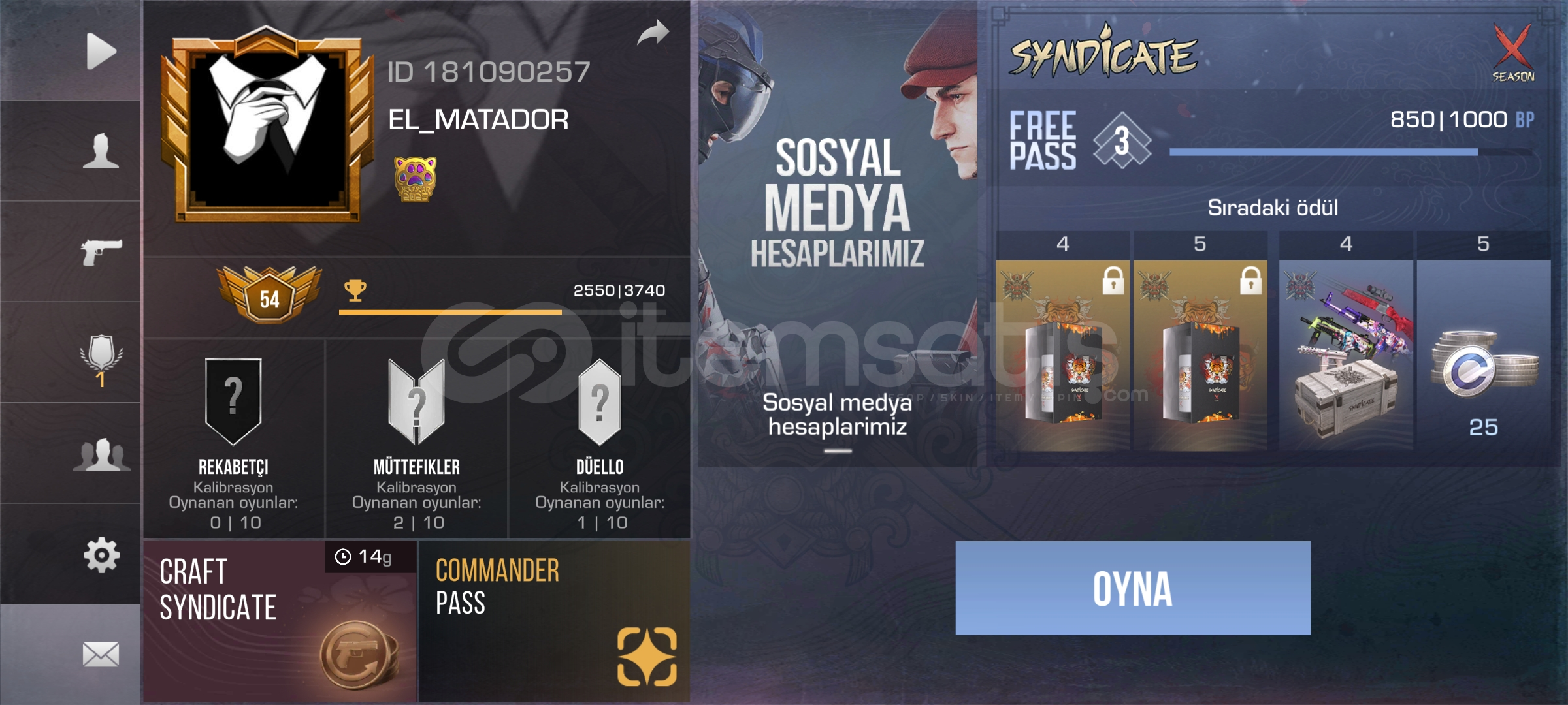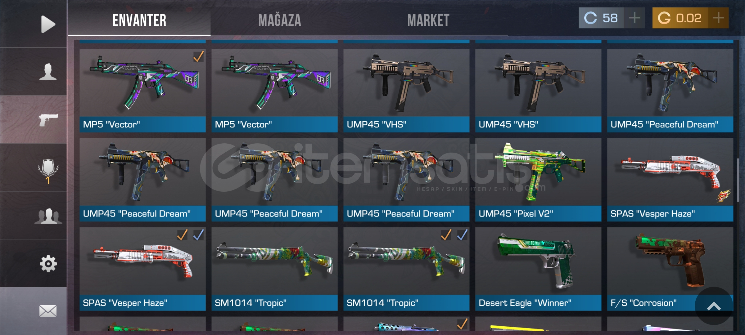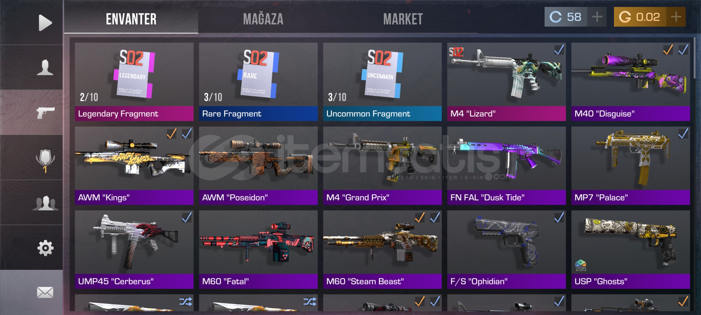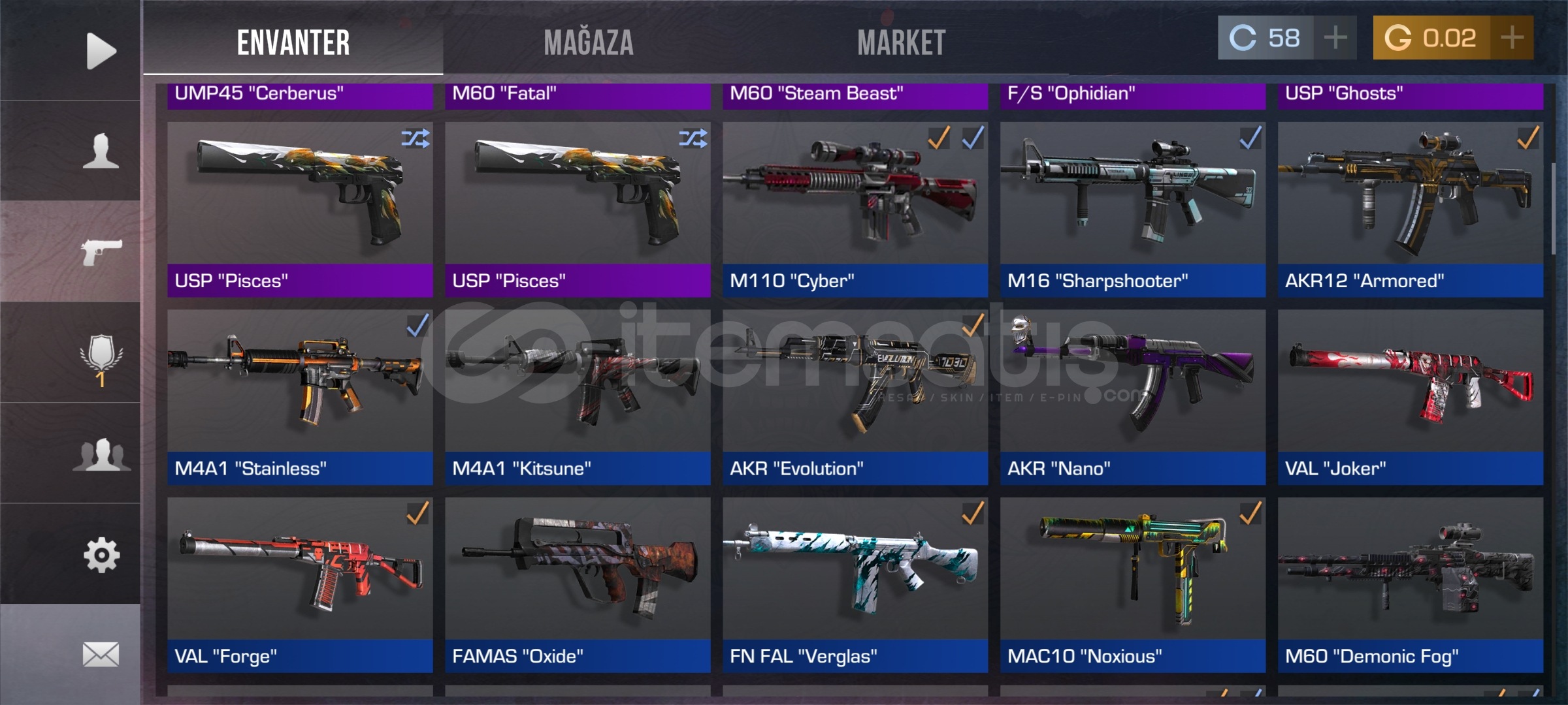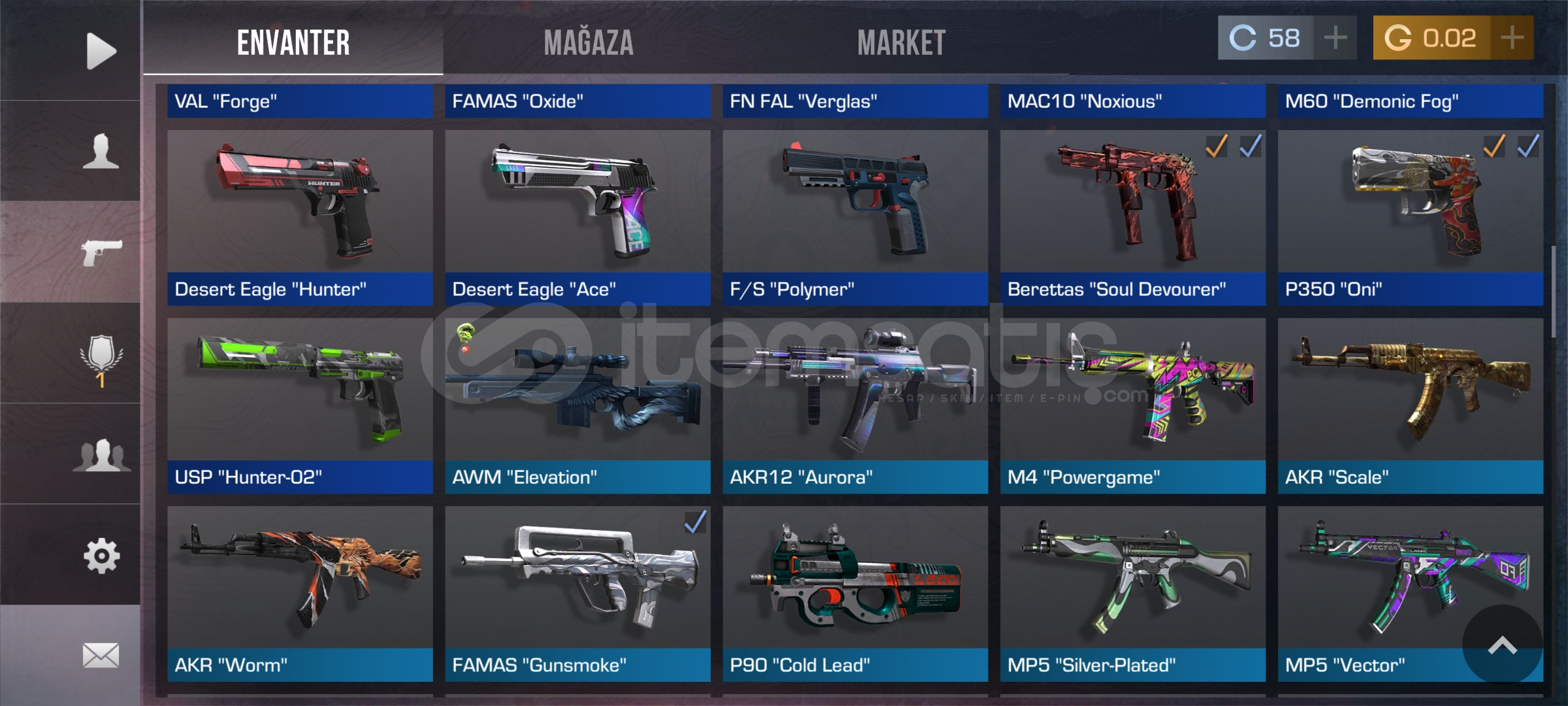 Hesapta şuan bıçak skini yok bir çok silah deseni ve destansı tılsımlar var