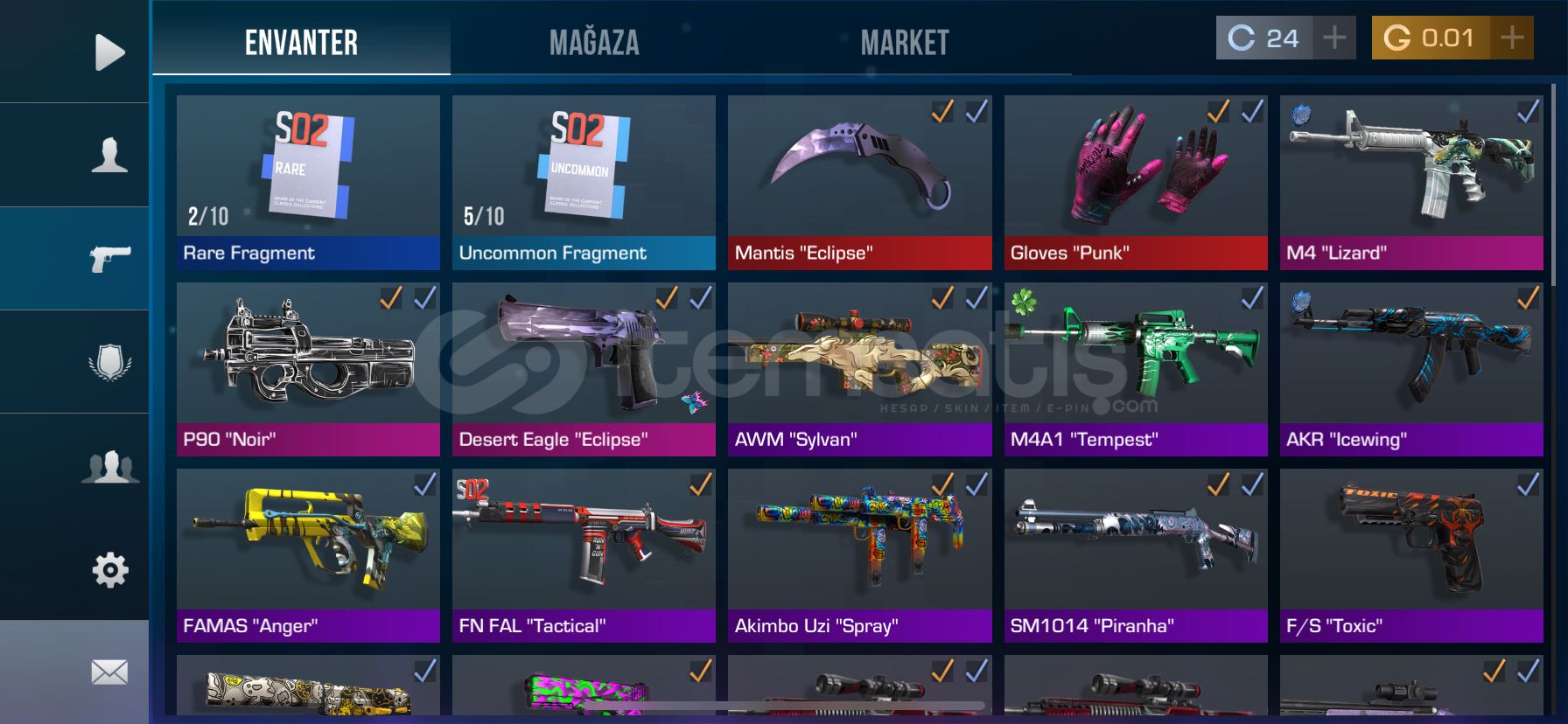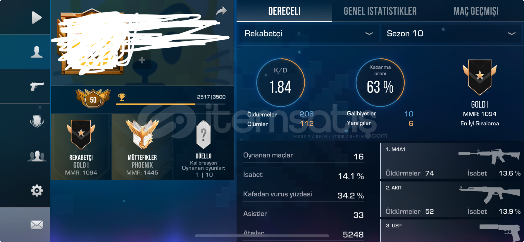 Hesapta eldiven + mantis bıçağı vardır.Hesabın KD'si iyi.Rekabetçi: Gold 1 Müttefik: Phoenix Alıcısına hayırlı olsun.