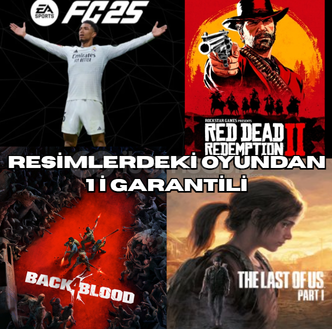 RESİMDEKİ OYUNLARDAN 1 TANESİ GELİR KEYLERİ KULLANIRKEN VİDEO KAYDI ALINIZ KEYLER %100 HATASIZDIR YALANLAYANLARA İADE EDİLMİYCEKTİR ÇIKABİLİCEK OYUNLAR : FC 25 59.99$RED DEAD REDEMPTION 2 59.99$BACK 4 BLOOD DELUXE EDITION 89.99$THE LAST OF US PART 1 59.99$