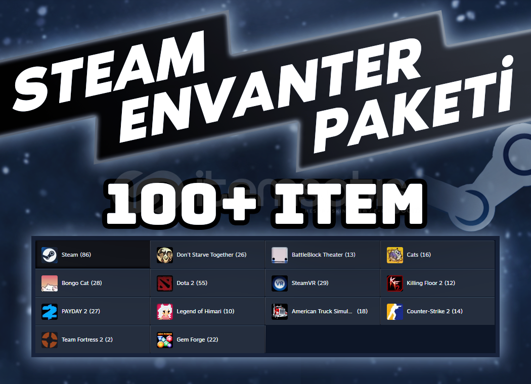 ✅ Steam envanterinize 14 FARKLI OYUNDAN ve HEPSİ BİRBİRİNDEN FARKLI toplamda 100'den fazla item eklenecektir.