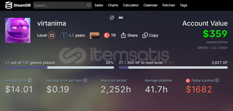 Selam dostlar, uzun süredir oyun topladığım steam hesabımı maddi yetersizliklerden dolayı satmak durumundayım;bu sebeple bu ilanı açtım .Steam hesabımın linki ve Steam Calculator'de bulunan detaylı istatistikleri aşağıya ekleyeceğim. Hesabın ederi Steam Calculator'de minimum olarak 359$ civarı -bu hesaplamada oyunlardaki gelişiminiz bildiğiniz üzere dahil edilmez- güncel...