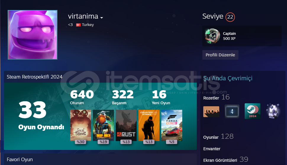 Selam dostlar, uzun süredir oyun topladığım steam hesabımı maddi yetersizliklerden dolayı satmak durumundayım;bu sebeple bu ilanı açtım .Steam hesabımın linki ve Steam Calculator'de bulunan detaylı istatistikleri aşağıya ekleyeceğim. Hesabın ederi Steam Calculator'de minimum olarak 359$ civarı -bu hesaplamada oyunlardaki gelişiminiz bildiğiniz üzere dahil edilmez- güncel fiyat olarak da 1682$ civarında.Hesapta 130 a yakın oyun ve RUST , RDR2 , GTAV , READY OR NOT , THE WICTHER , SEA OF THİEVES gibi çok çeşitli kaliteli oyunlar bulunmaktadır ; zaten hesabın linkini bırakacağım o yüzden inceleyebileceksiniz.Piyasa değerinin biraz altına bırakmayı daha uygun buluyorum çünkü hâli hazırda satıcılar gerçekten o kadar etmeyen hesapları ederinin iki bilemediniz üç katına satıyorlar, bu sebeplerden ötürü fiyat kelepir diyebileceğimiz bir fiyat bana göre(site komisyonlarından dolayı size sunmak istediğim fiyatın biraz daha üstüne çıkmak durumunda kaldım). Hesabın ilk sahibi şahsımdır, kesinlikle bir şüpheniz bulunmasın; eğer böyle bir şüpheniz olacaksa dahi site üzerinden benimle iletişime geçebilirsiniz fakat böyle bir şey olması dediğim gibi mümkün değil çünkü hesabın ilk sahibi benim.Hesap veya fiyat hakkında daha detaylı konuşabiliriz ; bana siteden veya discorddan ulaşabilirsiniz.